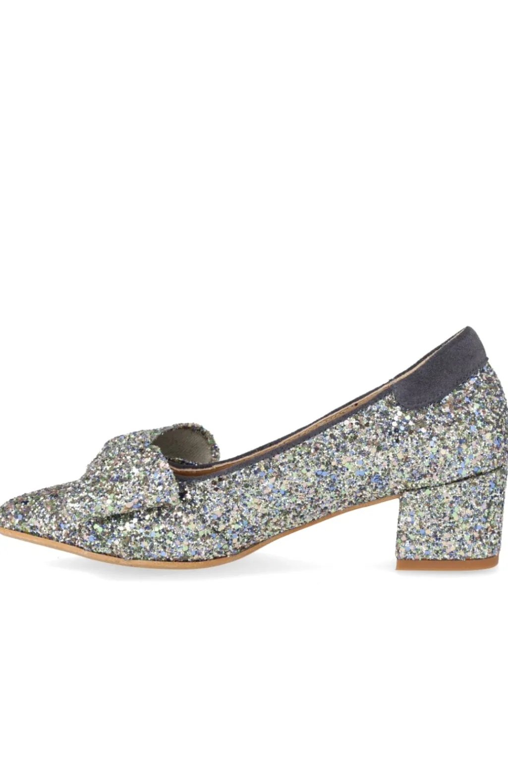 Sko fra Angulus med multifarvet glitteroverflade og indigo-detaljer. En sløjfe pryder den spidse tå, og blokhælen giver god støtte til både hverdag og fest.