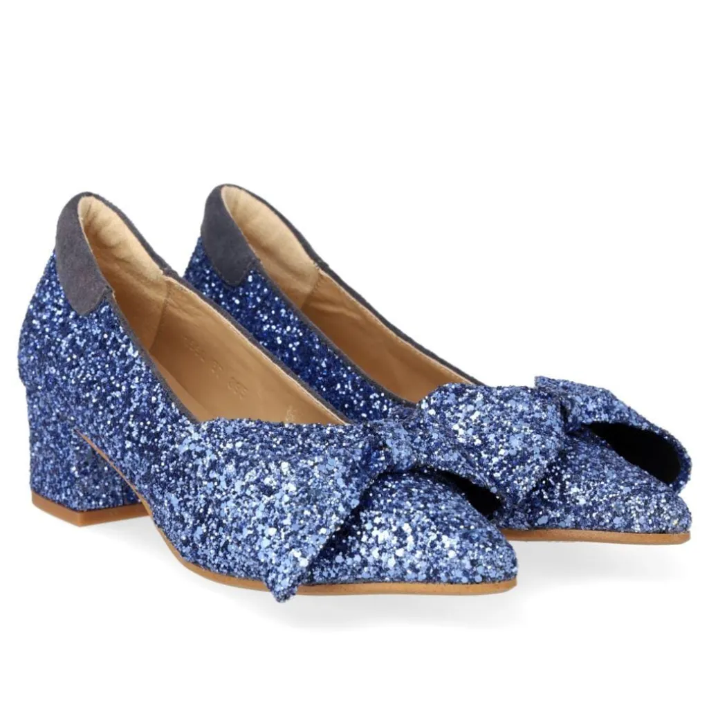 Stiletter fra Angulus i mørkeblå med glitter. Skoene har spids tå, skindfor og sløjfedetaljer, der gør dem velegnede til festlige anledninger.