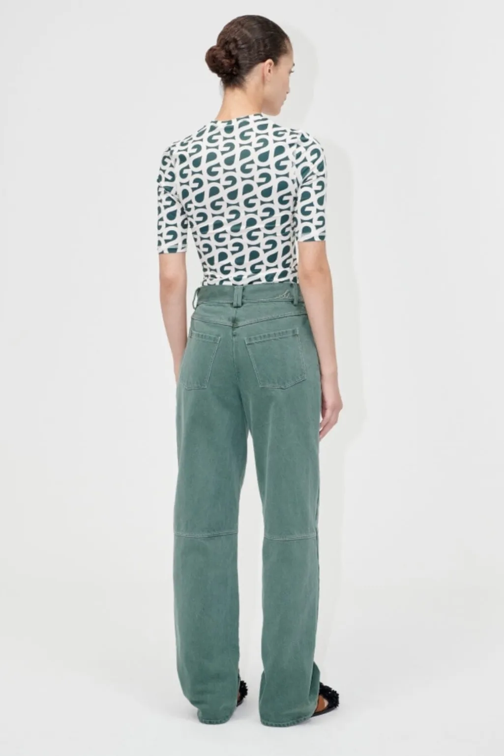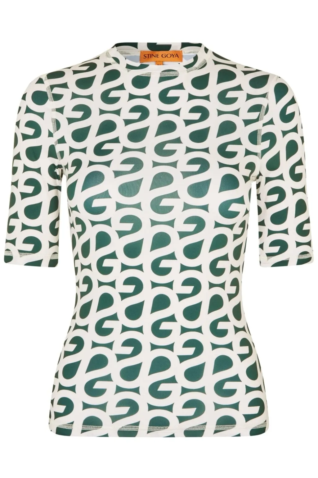 Skovgrøn t-shirt fra Stine Goya med korte ærmer og all-over logoprint i hvid. T-shirten har en høj hals og tætsiddende pasform, der følger kroppens form.
