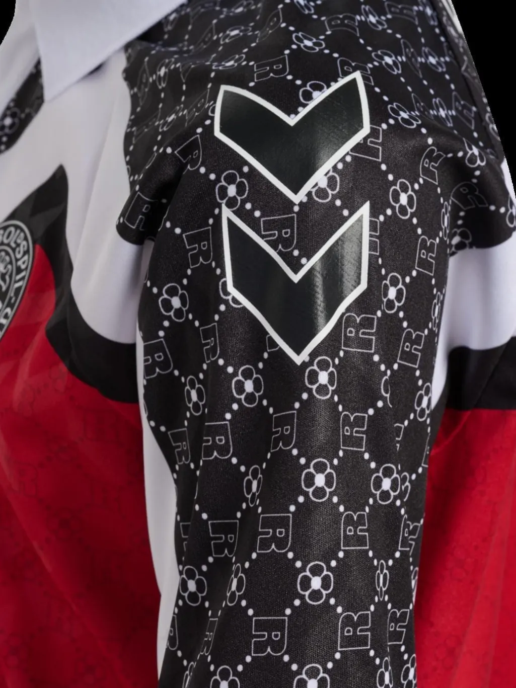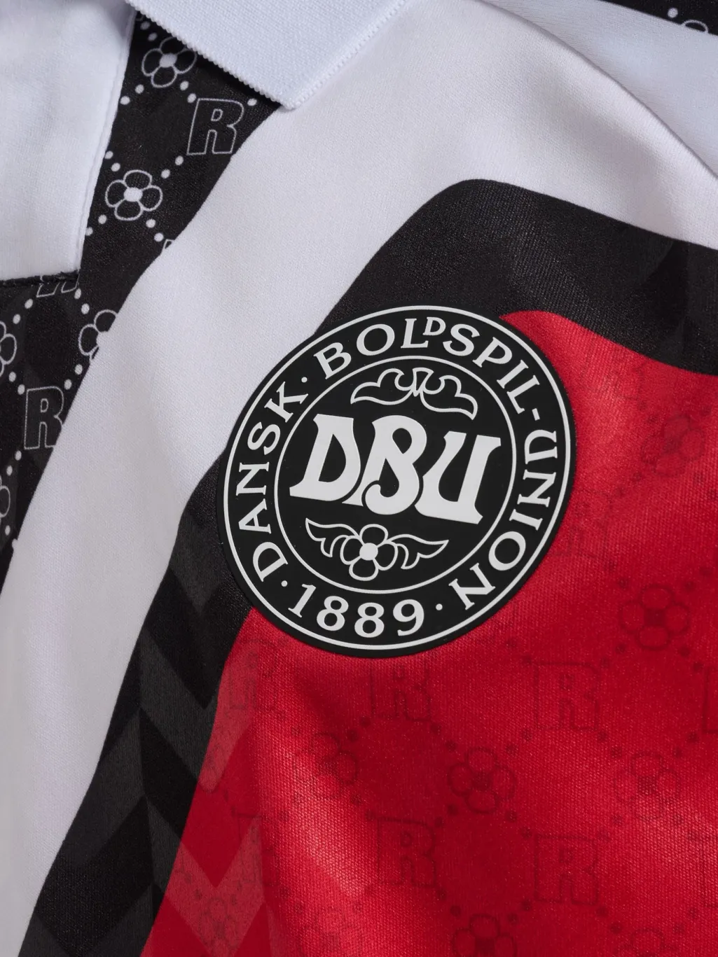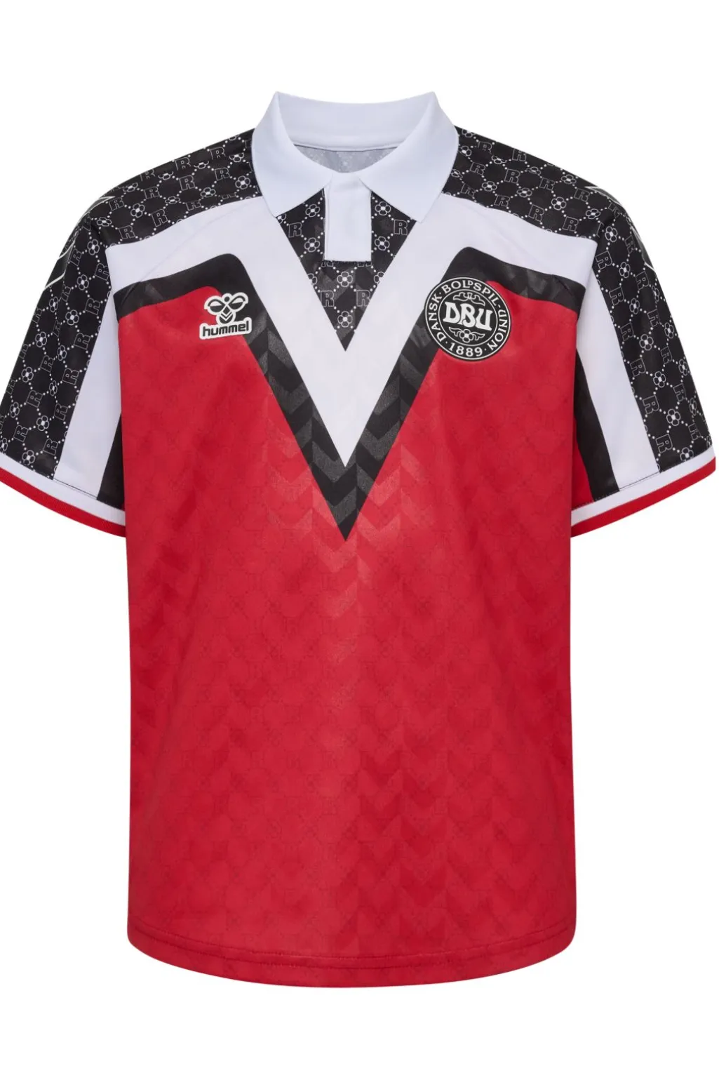 Rød fodboldtrøje fra DBU x Rotate med V-formet mønster og hvid polokrave. Trøjen har DBU-logo på brystet og Rotate-branding på ryggen.