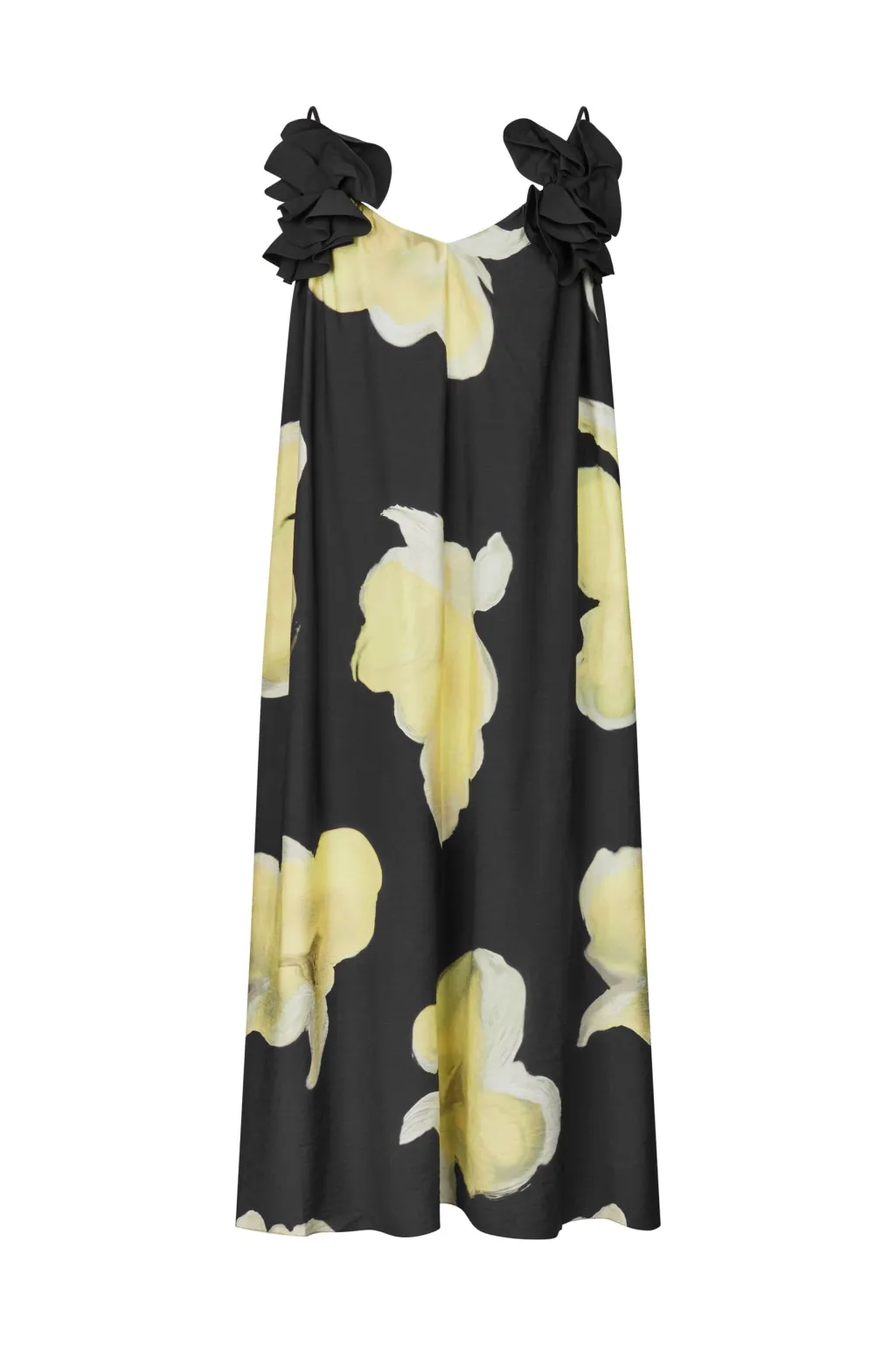 Lang kjole fra Stine Goya med et blomsterprint i gule nuancer på en mørk baggrund. Kjolen har rynker og bindedetaljer på stropperne.