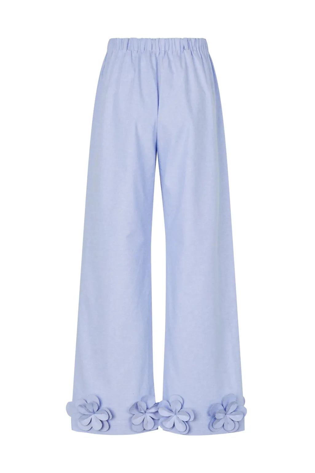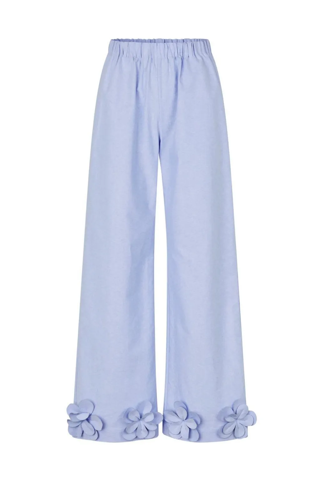 Lange bukser fra Stine Goya i lyseblå 100% økologisk bomuld. Bukserne har blomsterdetaljer ved buksekanten og en løs pasform med elastisk talje.