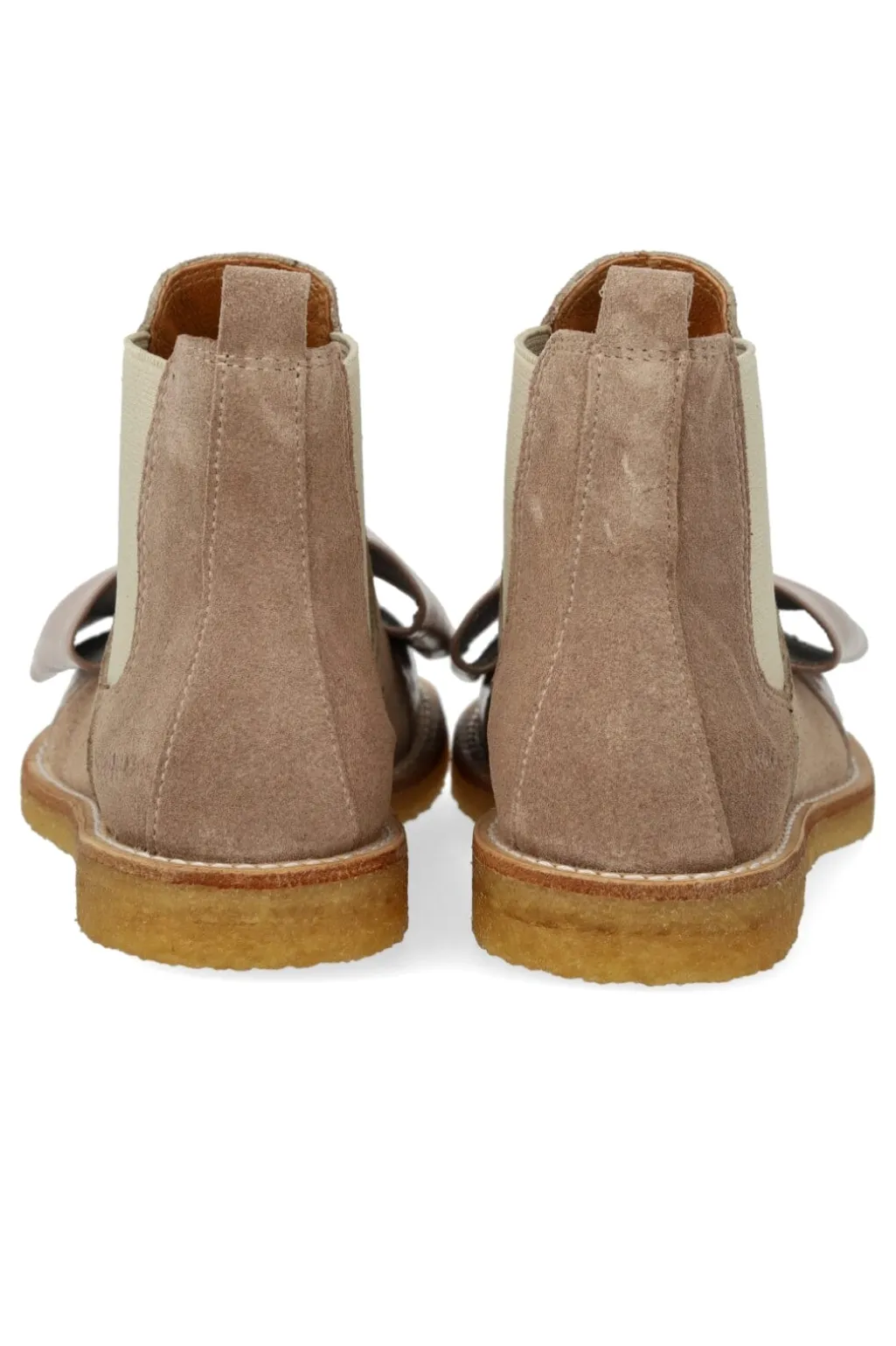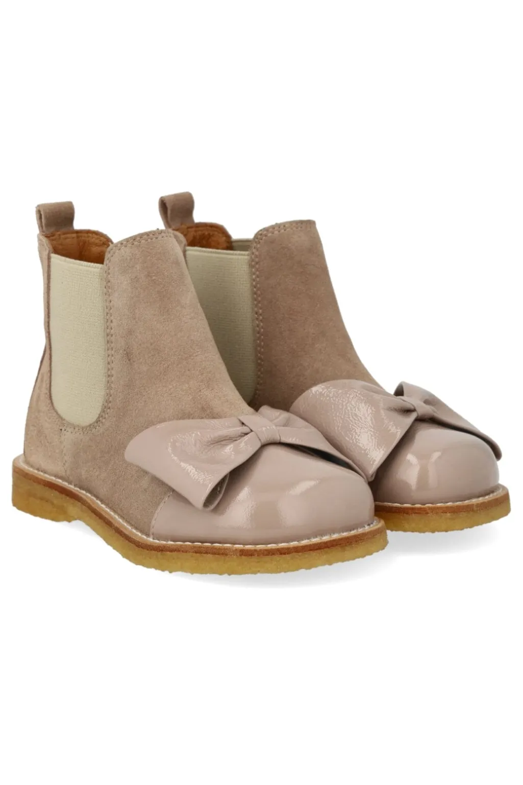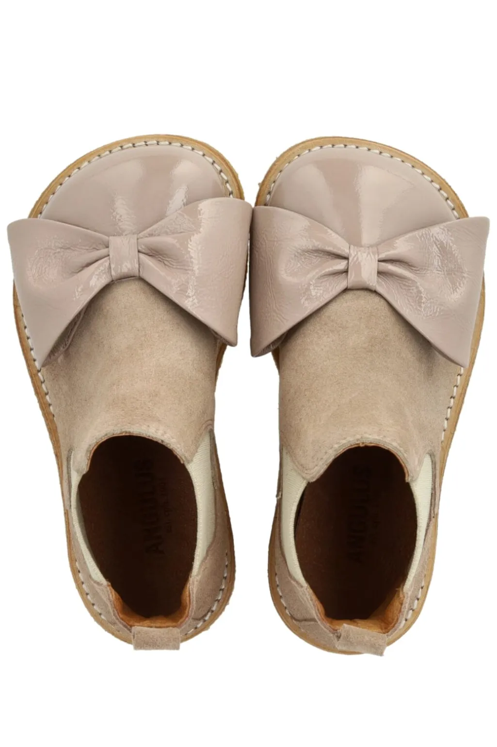 Chelsea-støvler fra Angulus i lyserødt læder med en skinnende sløjfe foran. Støvlerne er designet i Danmark og håndlavet i Portugal til formelle lejligheder.