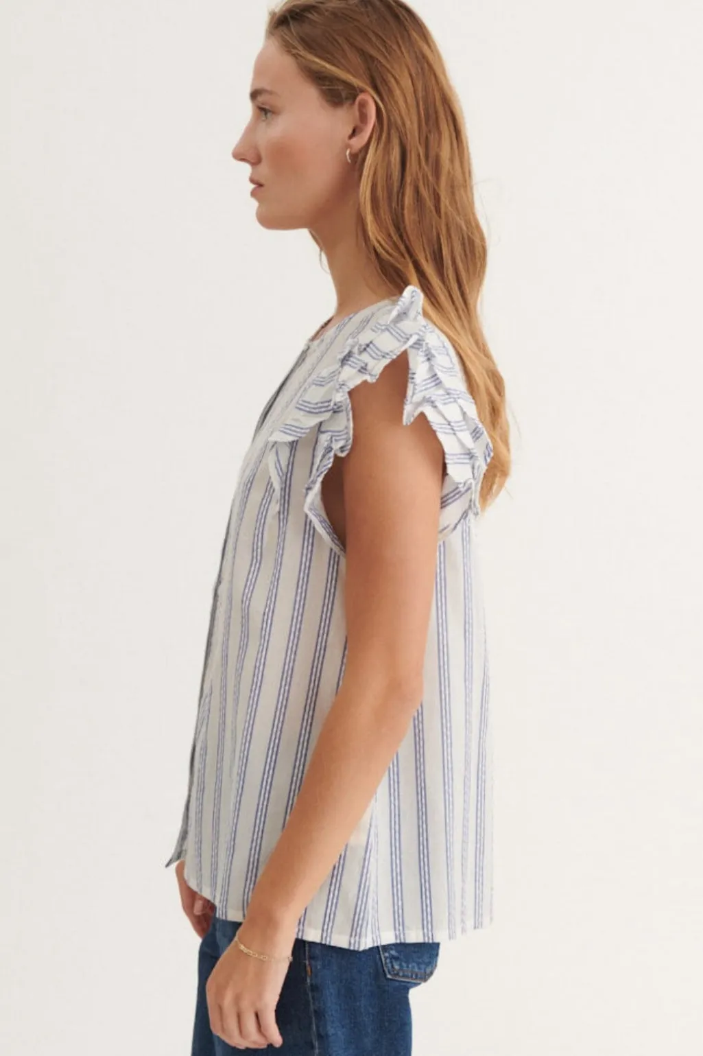 Stribet skjorte fra Basic Apparel i mørkeblå og hvide striber. Den ærmeløse model har rynkede flæser ved ærmegabene og en rund halsudskæring.