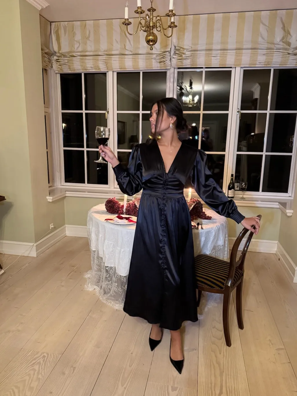 Sort satinkjole fra BYIC med skinnende overflade. Kjolen har V-udskæring, knapper langs fronten og markeret talje med rynkedetaljer. De lange ærmer har smockede manchetter med elastik.
