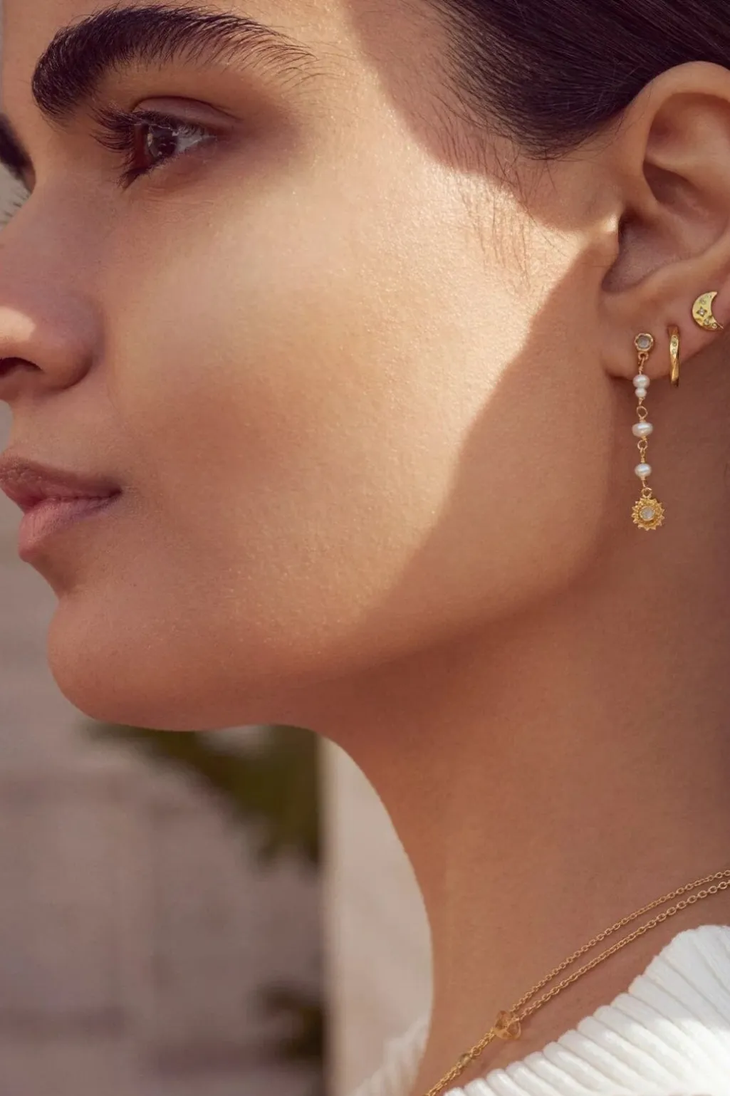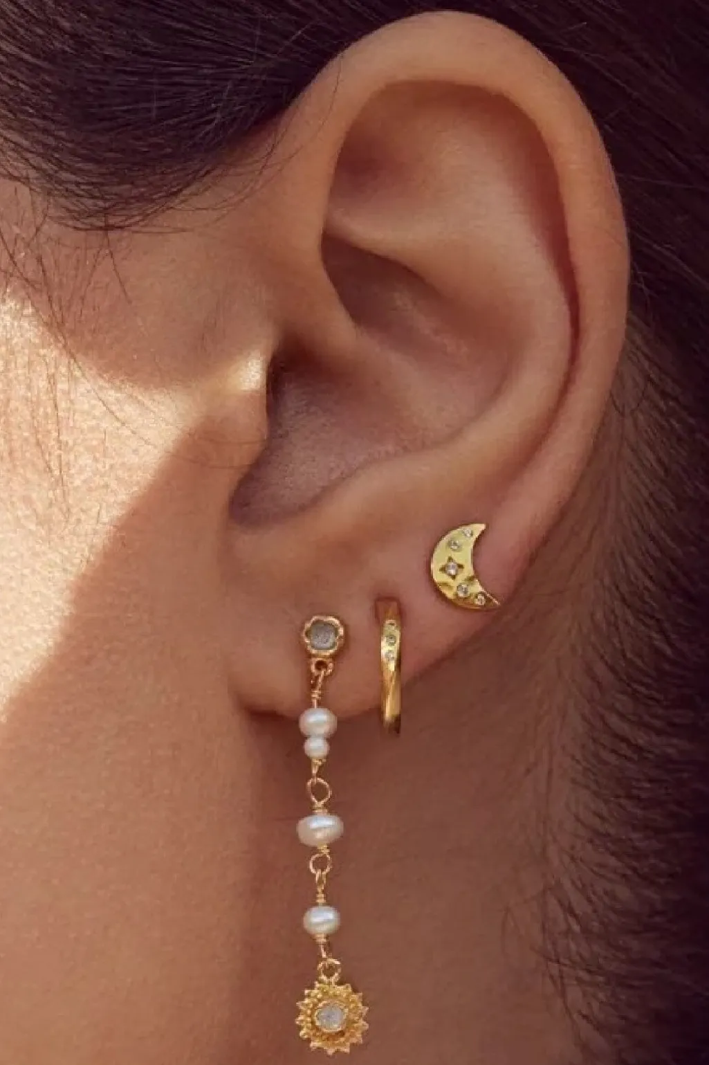 Guldbelagte ørestikkere fra Maanesten med måneformet design og krystaller. Smykkerne er håndlavet i genanvendt sterlingsølv og belagt med 18 karat guld.