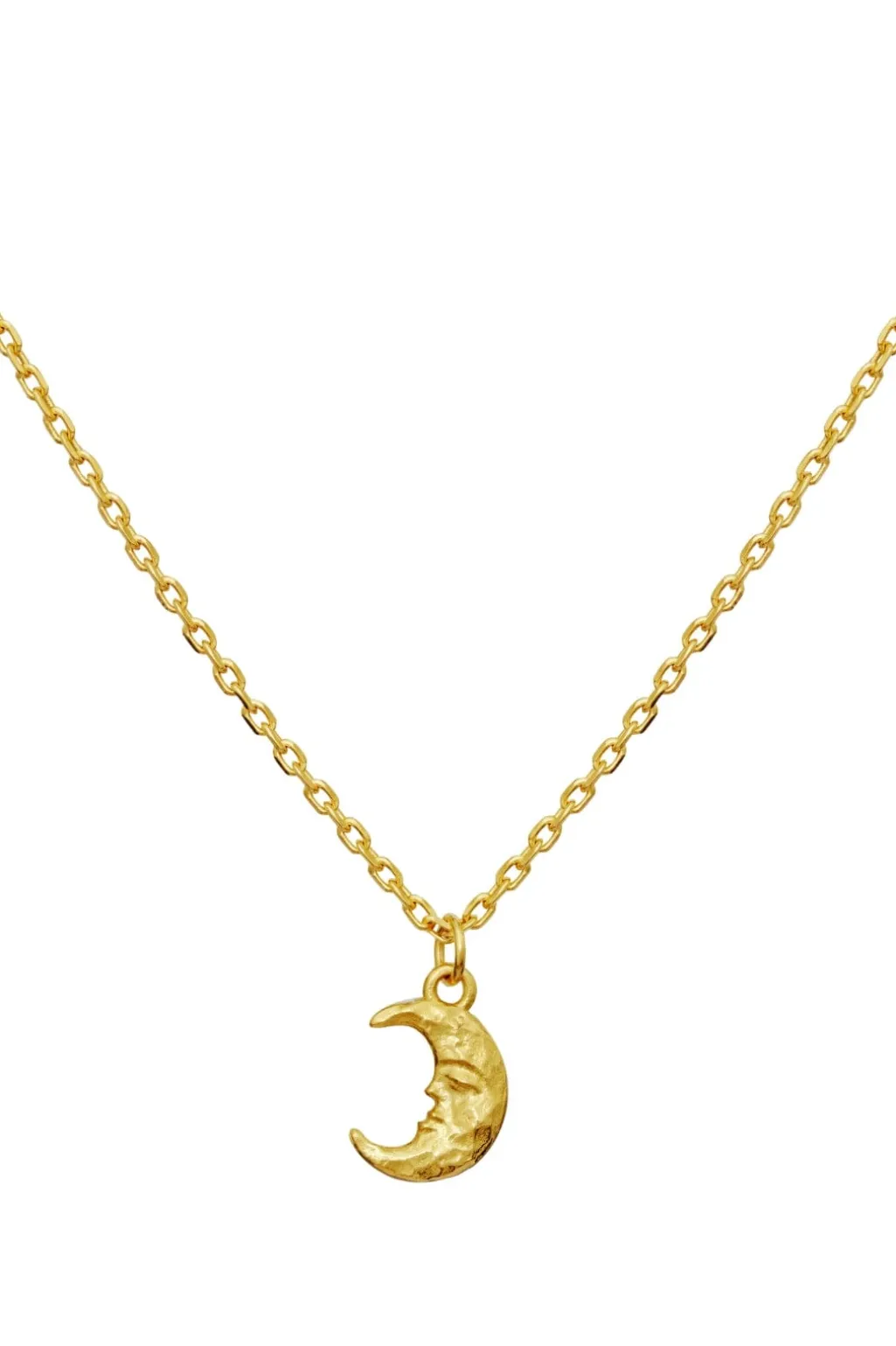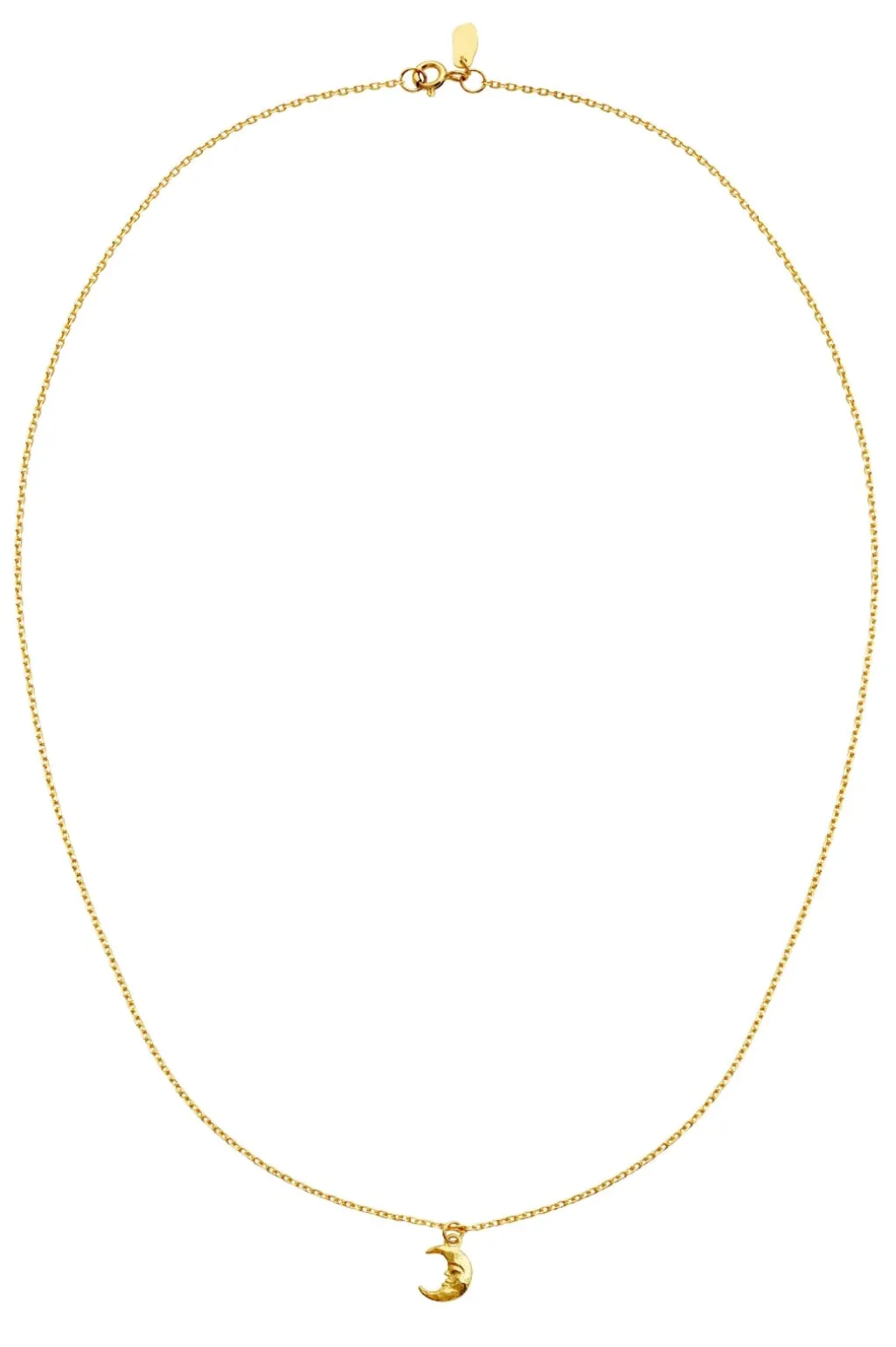 Halskæde fra Maanesten med et halvmåneformet vedhæng i guld. Vedhænget har et ansigt indgraveret på månens overflade.