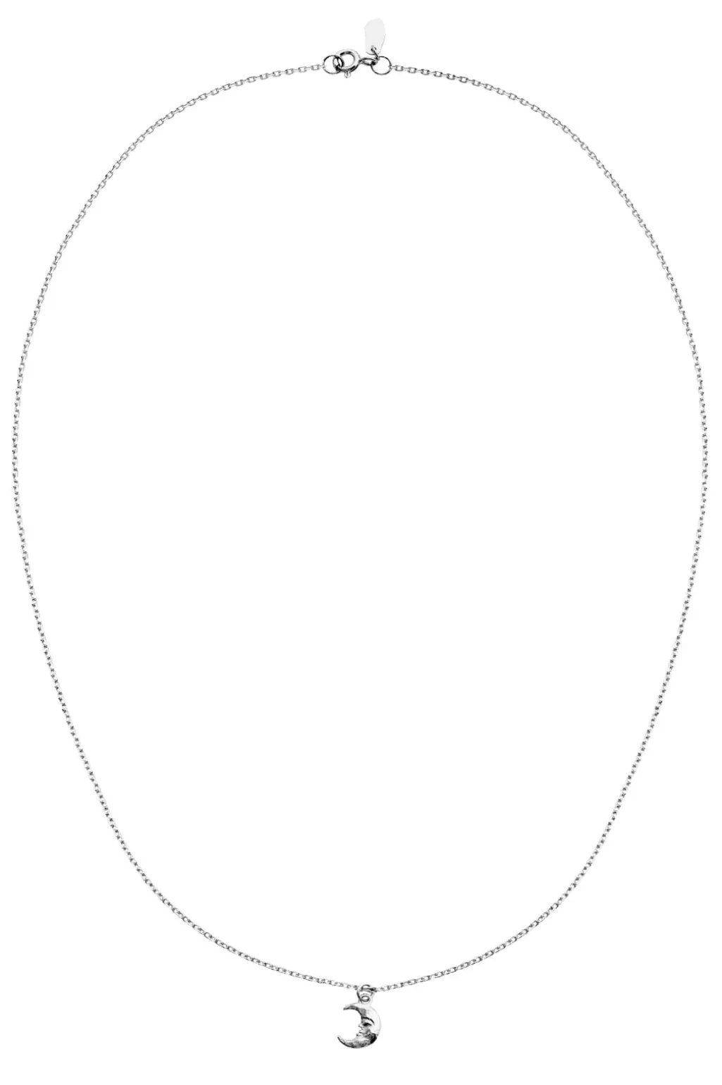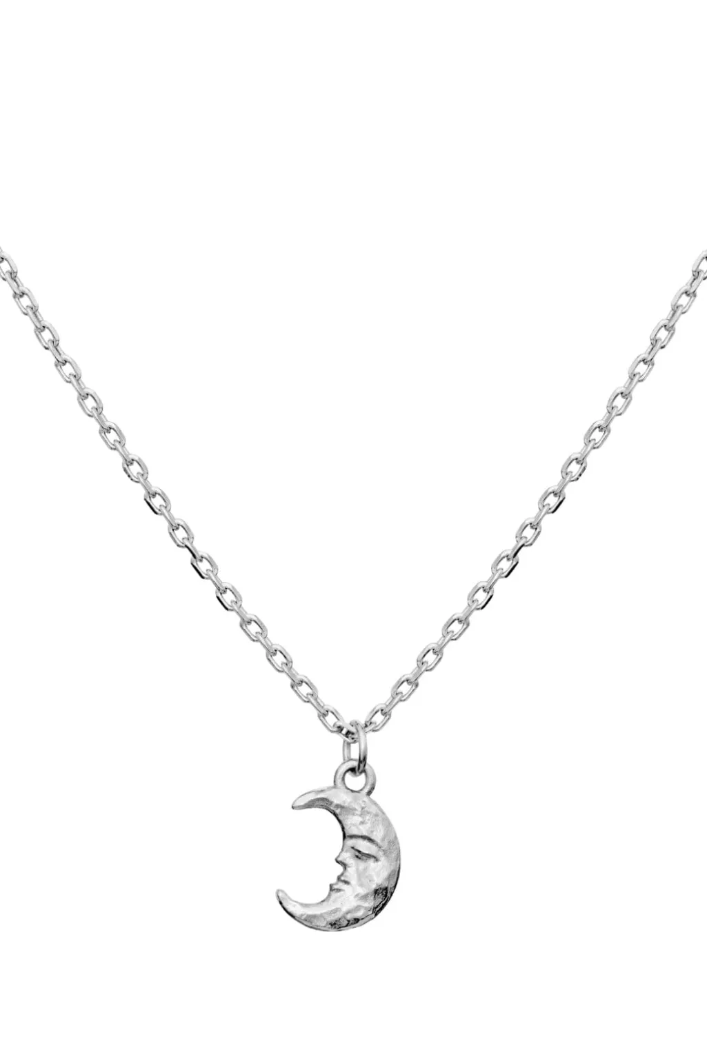En sølvhalskæde fra Maanesten med et halvmånevedhæng, der har et ansigt. Halskæden er lavet af 935 sterling sølv i en sølvfarvet finish.