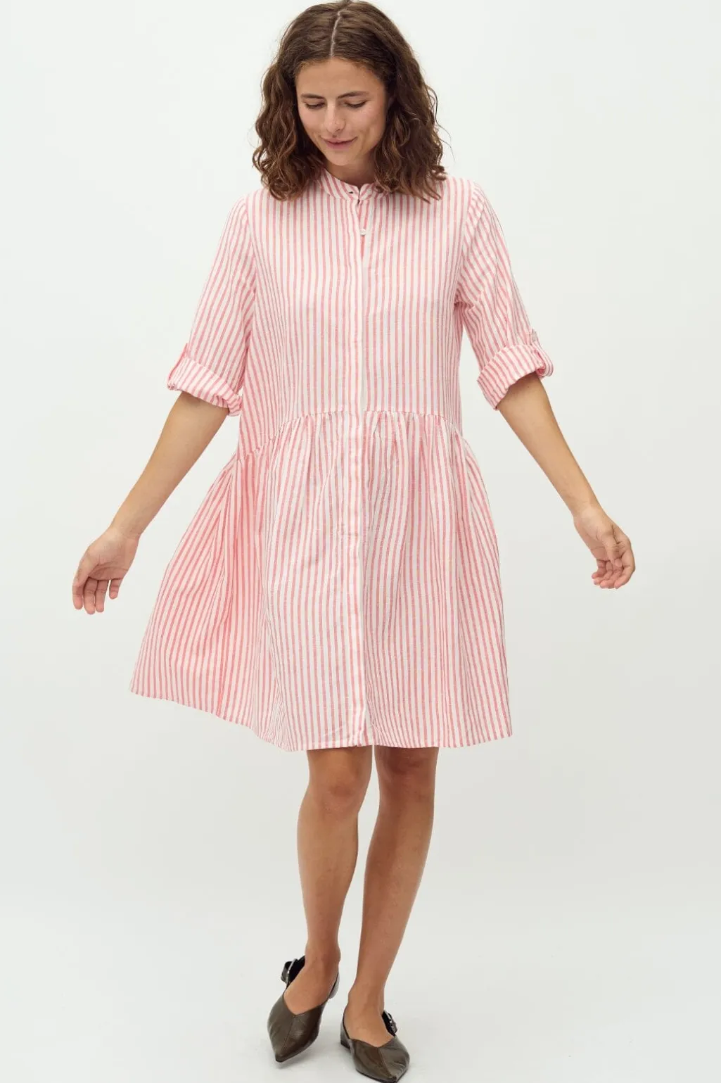 Stribet kjole fra MbyM med skjortekrave og knaplukning foran. Den har en samlet talje og trekvartlange ærmer. Kjolen kommer i koral og hvide striber.