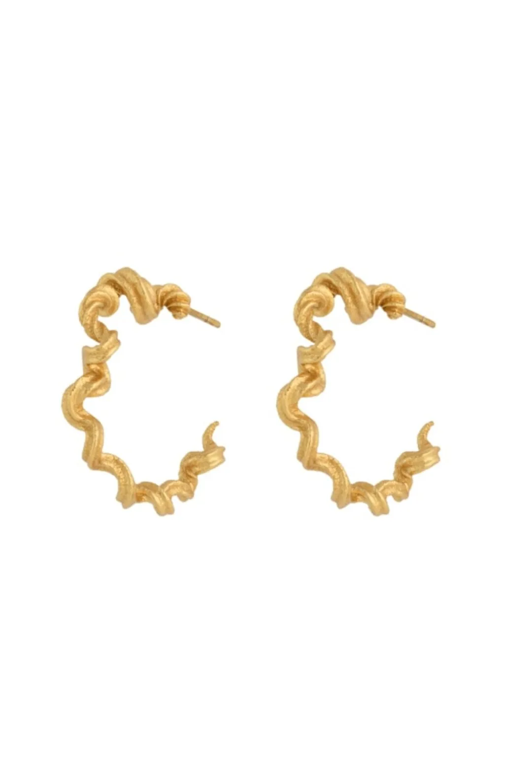 Gyldne hoops-øreringe fra House Of Vincent med et snoet design. Øreringene har en blank overflade, der reflekterer lyset og fremhæver det bølgede mønster.