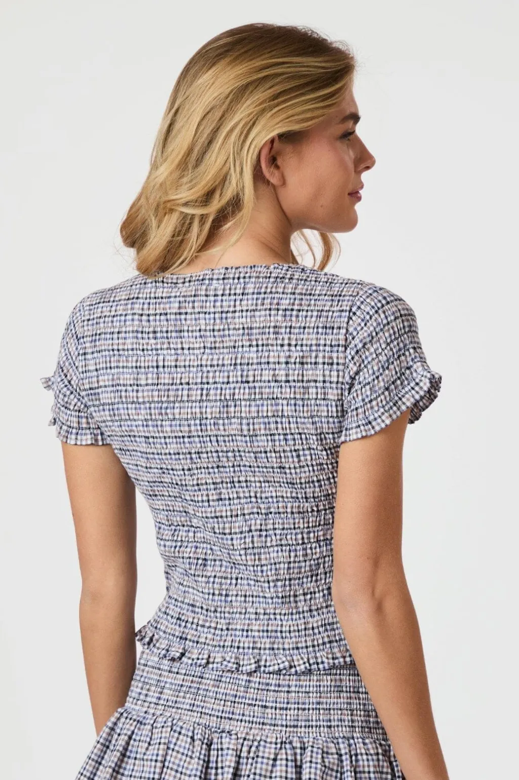 Blå og hvid ternet top fra Neo Noir med smockdetaljer. Toppen har en tætsiddende pasform med korte ærmer og rund hals. Det dobbeltternet mønster skaber et klassisk udtryk.