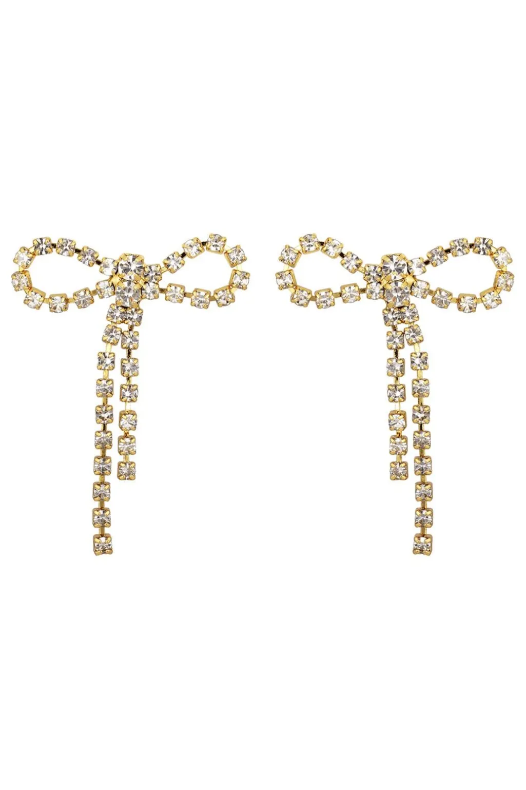 Plissé Copenhagen laver sløjfeformede øreringe. De har et sløjfedesign øverst med to nedhængende stænger. Små sten dækker hele øreringen og giver et skinnende udtryk.