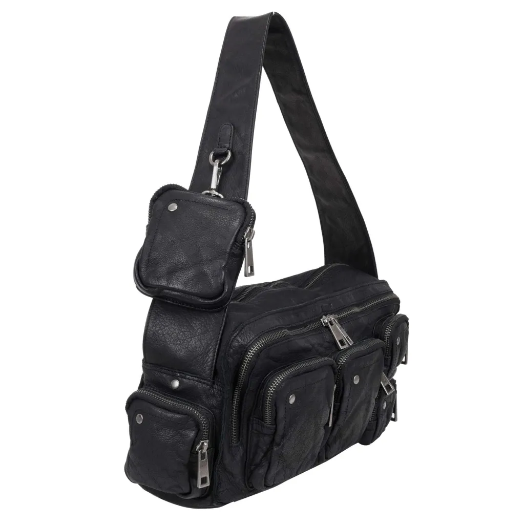 Sort skuldertaske fra Núnoo med flere udvendige lommer og sølvfarvede detaljer. Tasken har en aftagelig pung og forskellige rum til organisering af indhold.