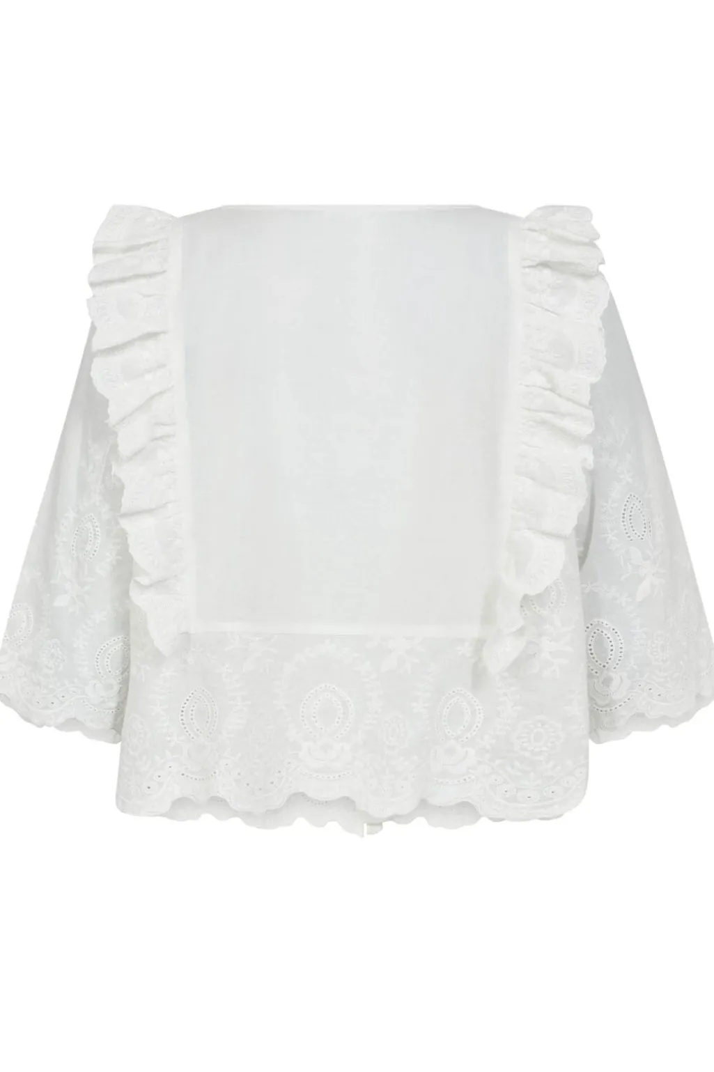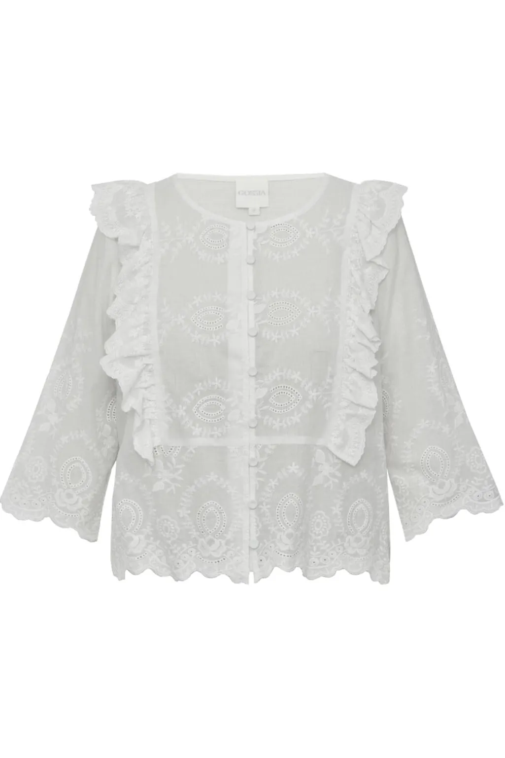 Hvid skjortebluse fra Gossia med broderede mønstre og flæser. Blusen har rund halsudskæring, 3/4-ærmer og knaplukning foran.