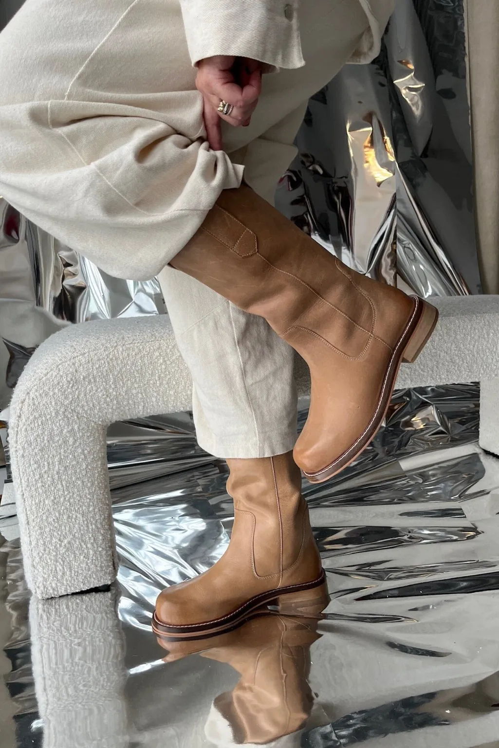 Mellemlang støvle i lysebrunt læder. Støvlen har rund tå, lav hæl og lynlås på indersiden. Materiale: Læder Sål: Neolite Skafthøjde: 31 cm målt på siden af en str. 37 Skaftomkreds: 38 cm målt ved øverste kant på en str. 37 Hæl: 3 cm Indersål: Læder og med 4-6 mm Copenhagen shoes foam