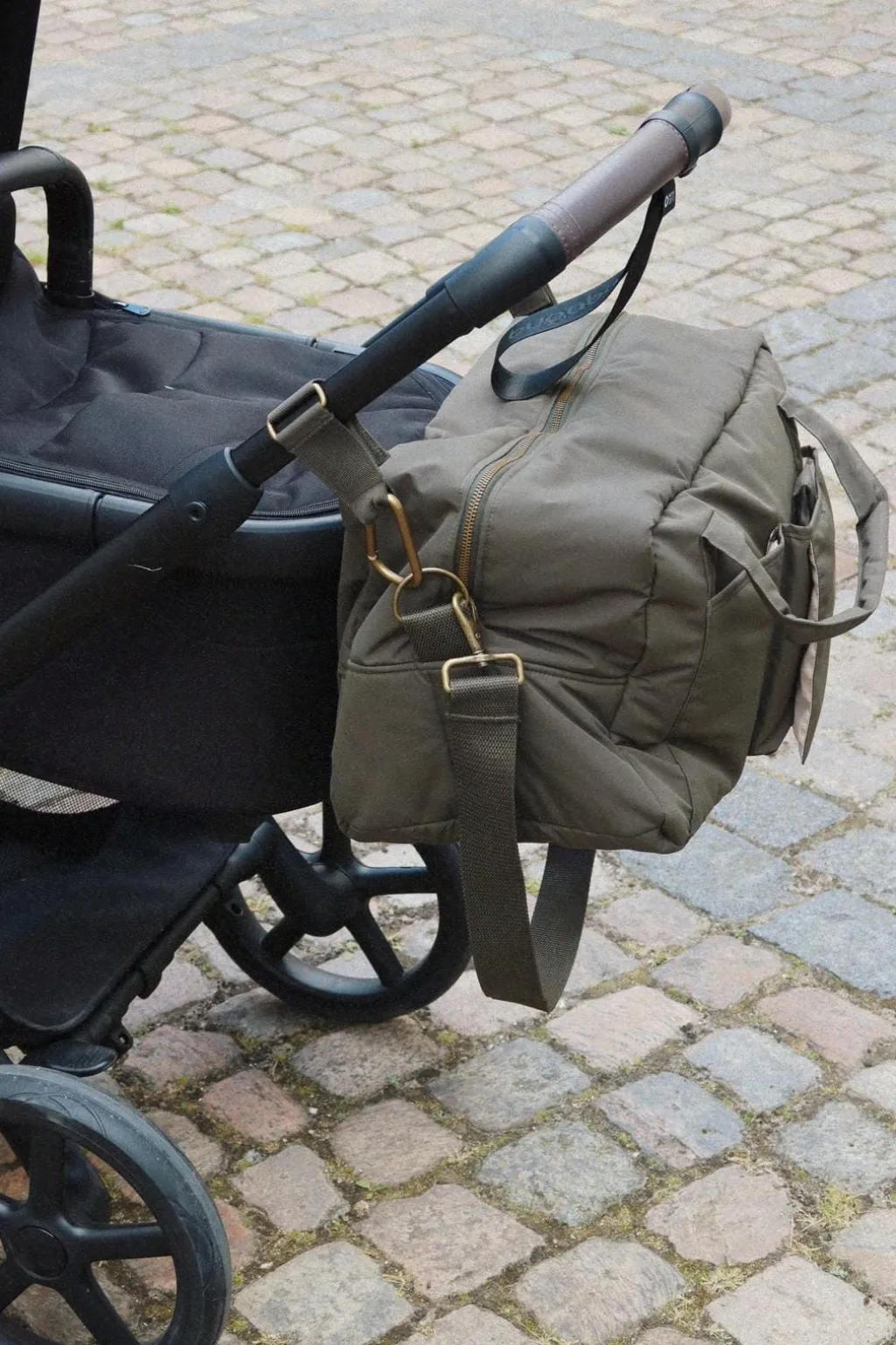 Den har en aftagelig stop, så tasken også kan bruges med de almindelige håndtag. All you need tasken lukkes ved hjælp af lynlås og har D-ringe på hver side så den kan sættes fast på en barnevogn og/eller klapvogn.