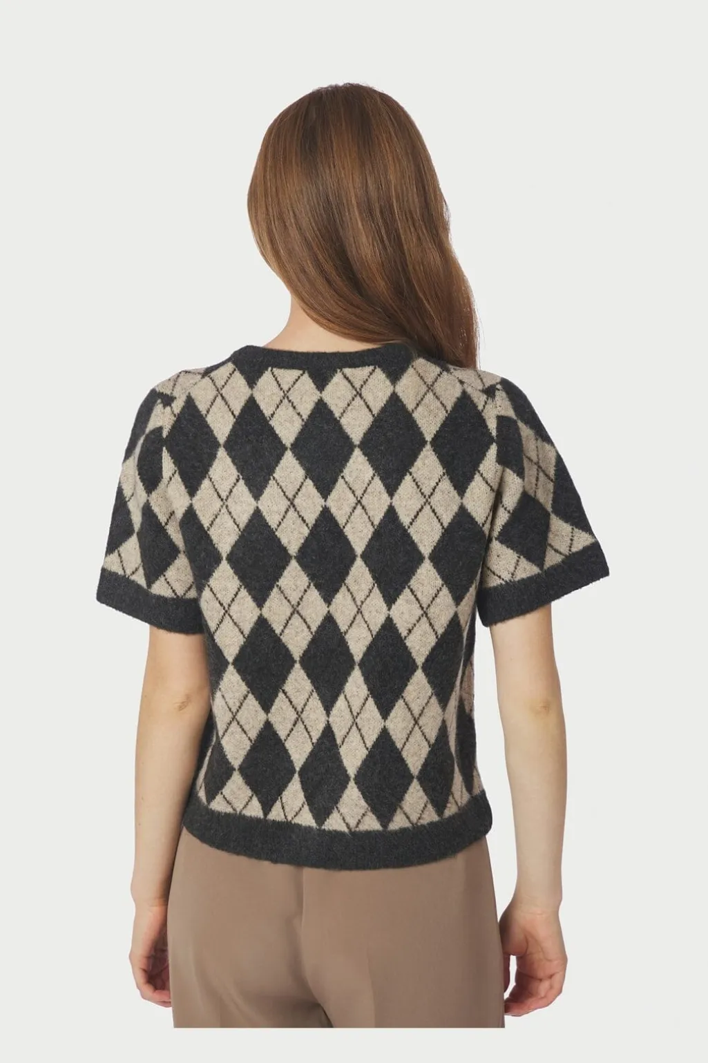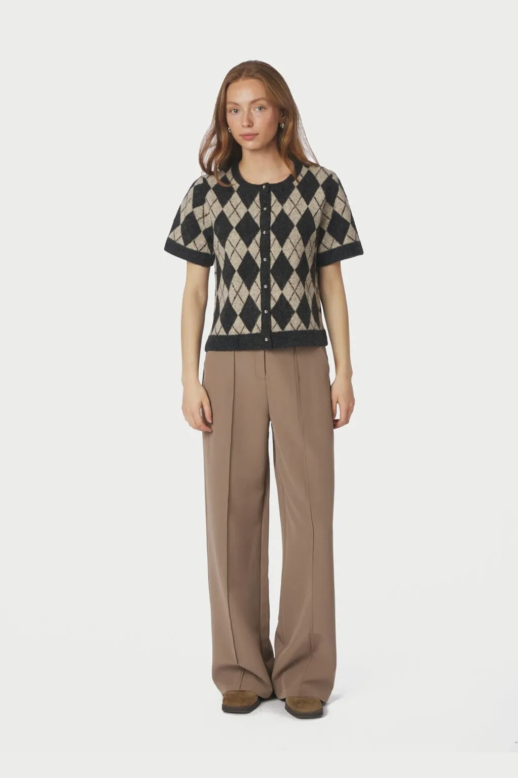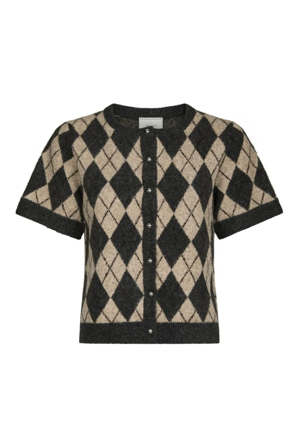Kortærmet strikcardigan fra Neo Noir med et ternet argyle-mønster i beige og grå. Cardiganen har en rund halsudskæring og knaplukning foran.