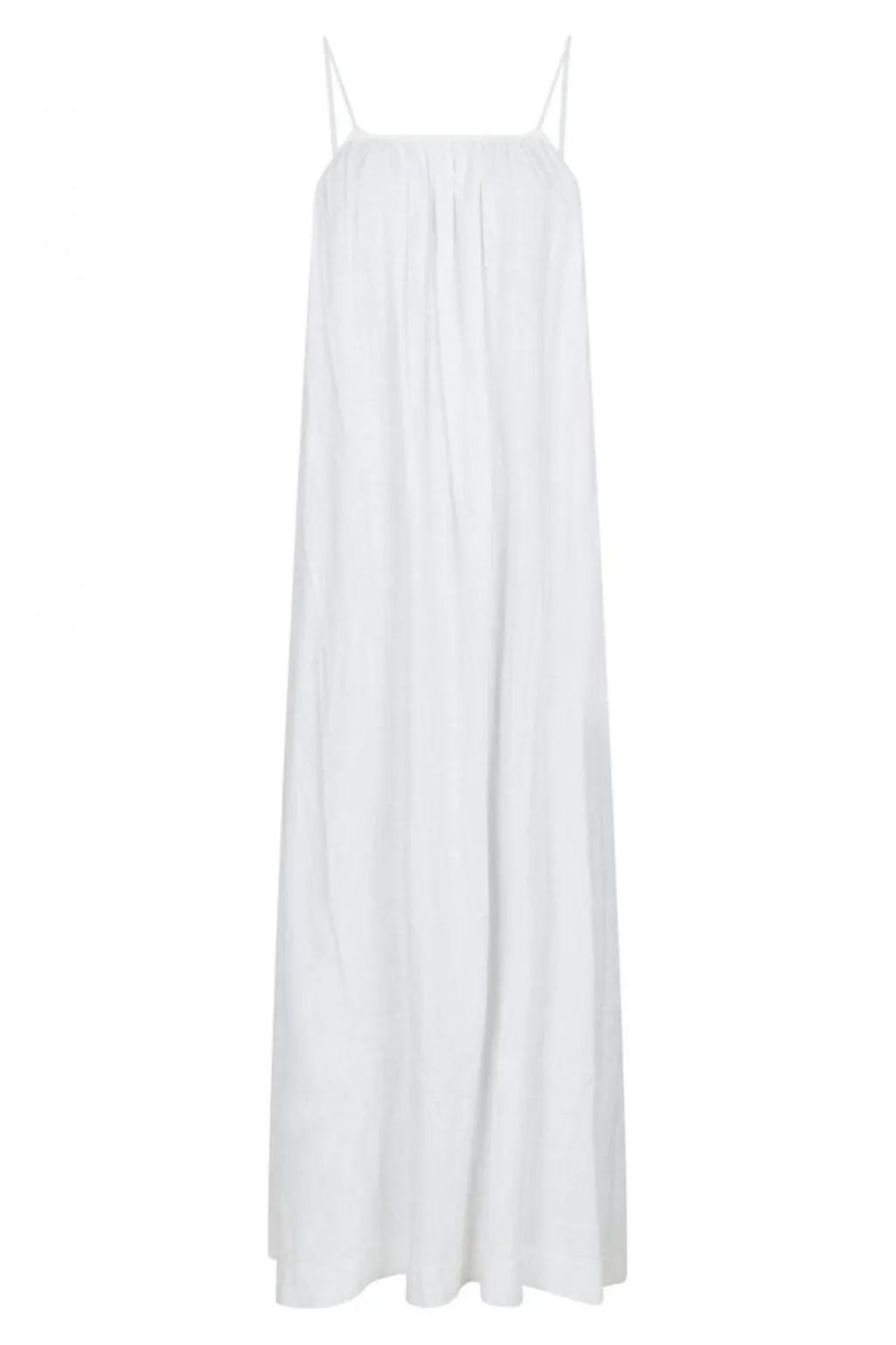 Hvid kjole fra Neo Noir med tynde stropper og løs pasform. Kjolen har en elastisk ryg og flæsedetaljer, der giver den et let og luftigt udtryk.