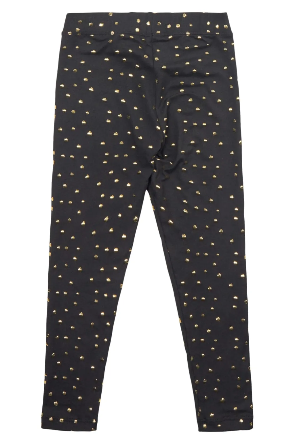 Sorte leggings fra Liberté Ami med guldprikker spredt over hele designet. Det lette materiale og den elastiske linning giver god bevægelsesfrihed til aktive børn.