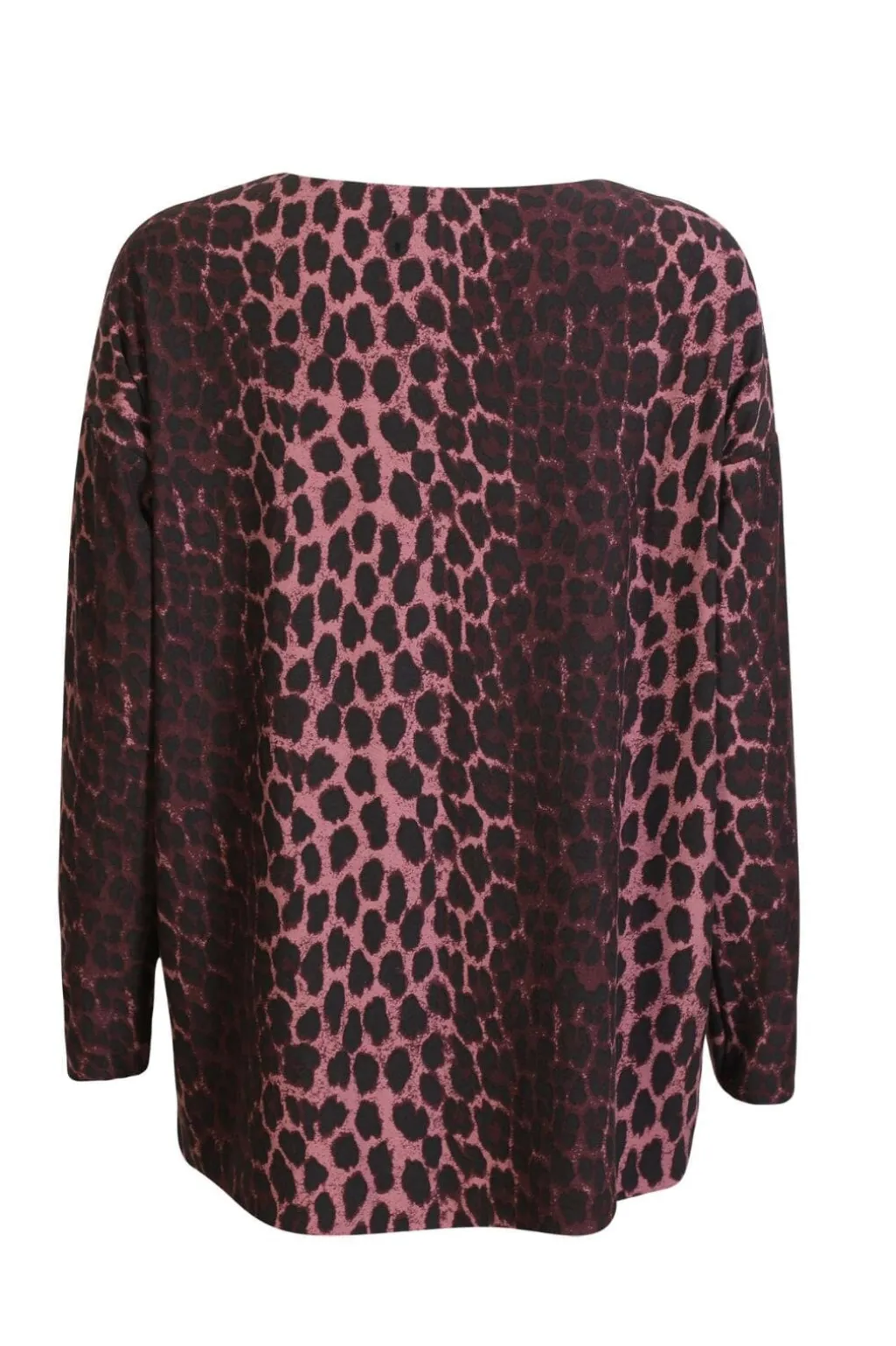 Langærmet top fra Liberte med leopardmønster i bordeaux og pink nuancer. Toppen har en løstsiddende pasform og en rund halsudskæring.