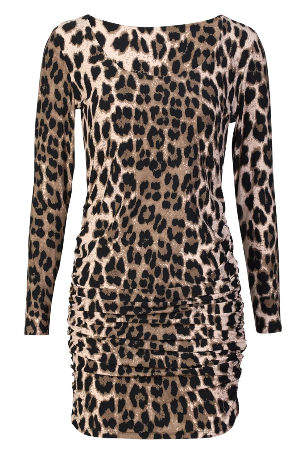 Lang kjole fra Liberte med leopardprint i beige og sorte nuancer. Kjolen har rynkedetaljer langs siderne og rund halsudskæring. Den lange silhuet passer til både høje hæle og flade sko.