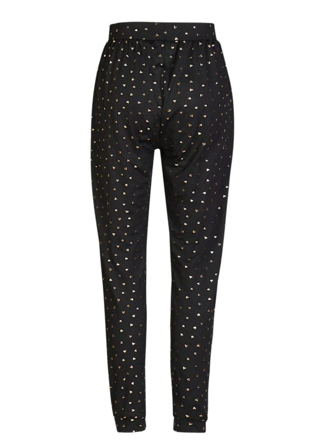 Sorte bukser fra Liberte med gyldne hjerter i print. Løs pasform og ankel-længde gør dem velegnede til afslappet brug derhjemme eller i hverdagen.