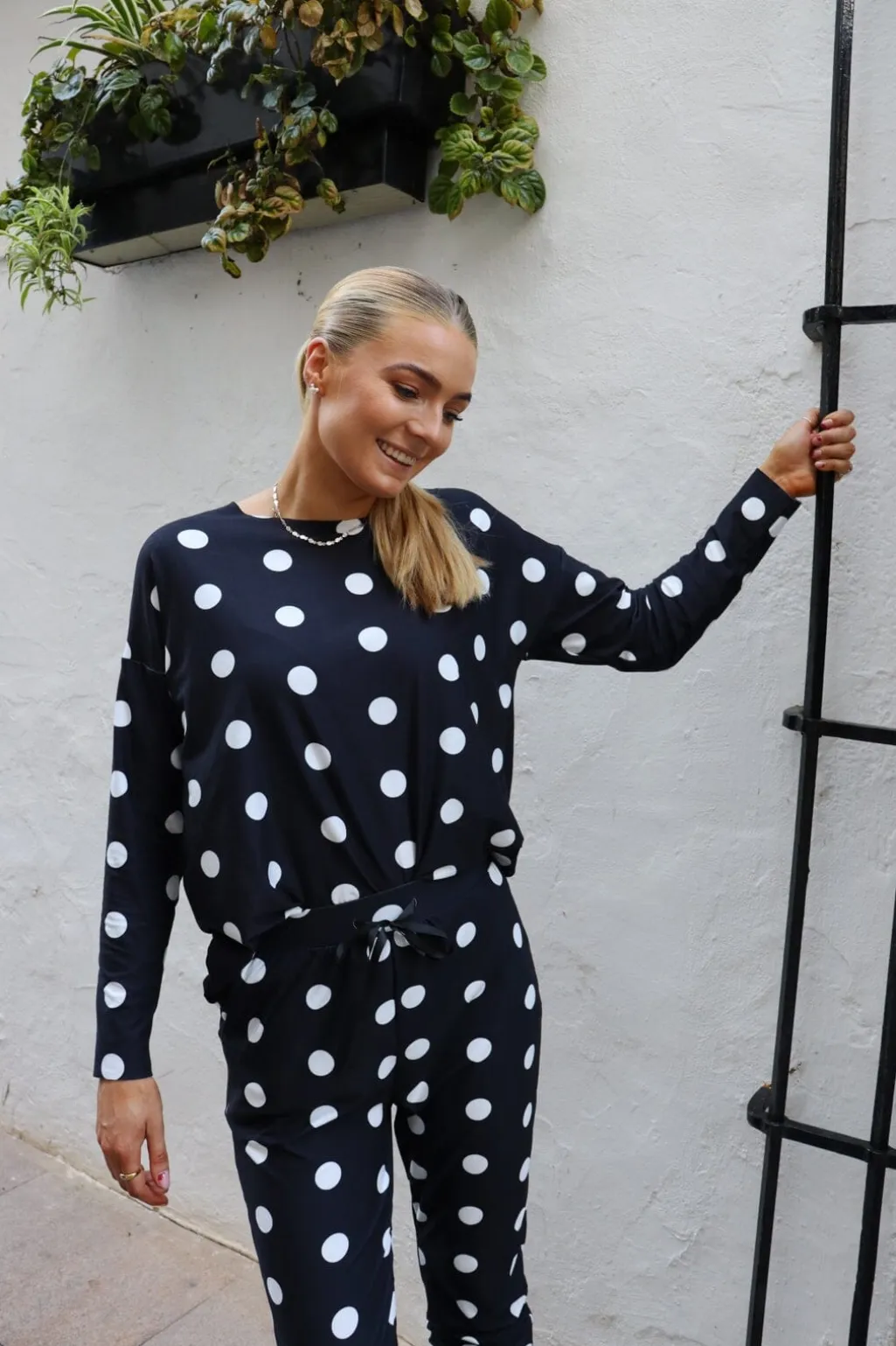 Sorte bukser fra Liberte med store hvide prikker. Bukserne er i Alma-kvalitet og har en løs pasform med snøre i taljen.