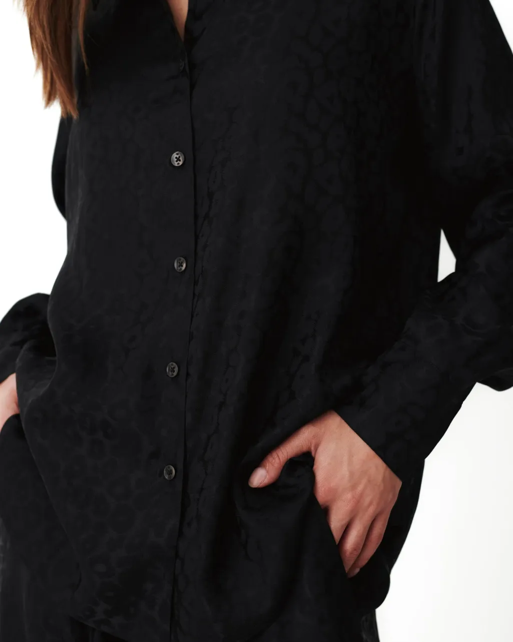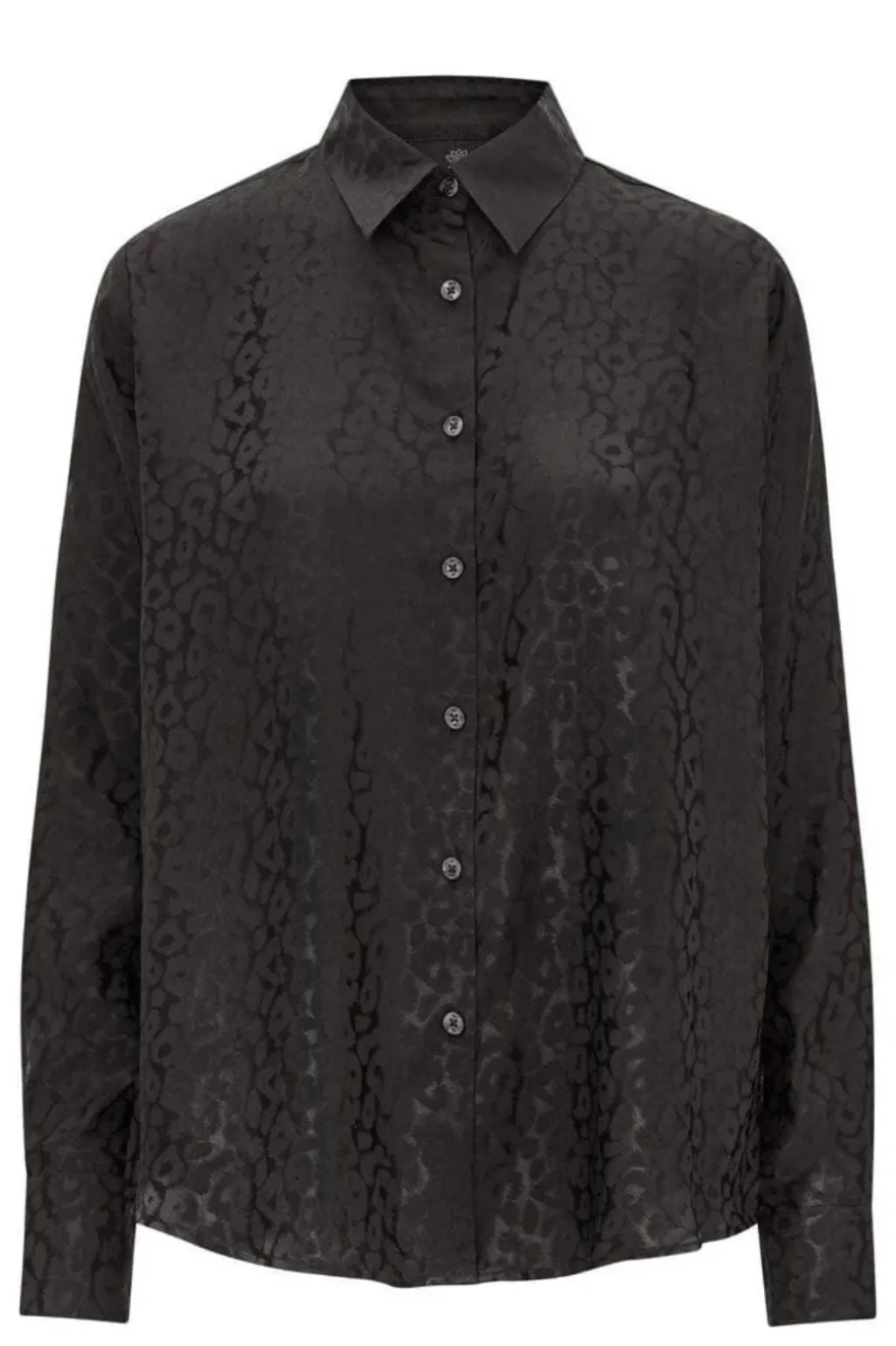 Sort skjorte med et diskret leopardmønster. Den er fremstillet af en blanding af silke og viskose, som giver et blødt og glat stof med et subtilt print.