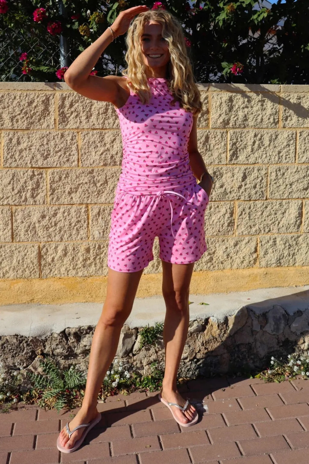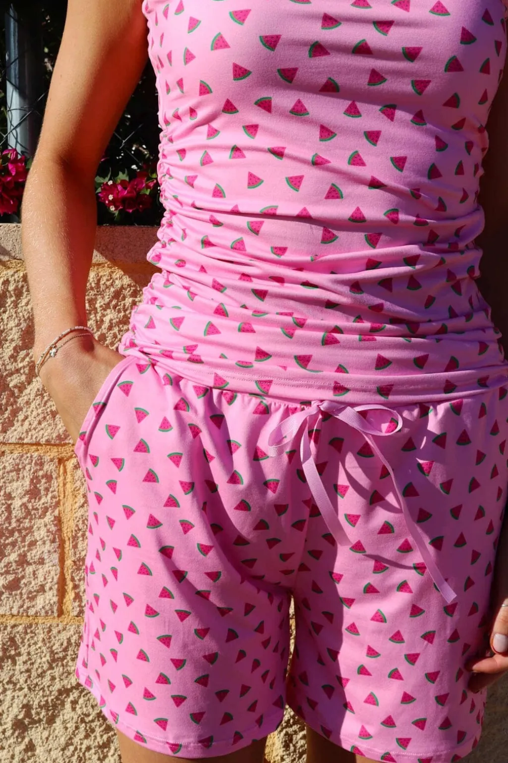Pink shorts med vandmelonprint fra Liberte. Den løse pasform og det sommerlige mønster gør shortsene velegnede til både hjemmebrug og fritidsaktiviteter.