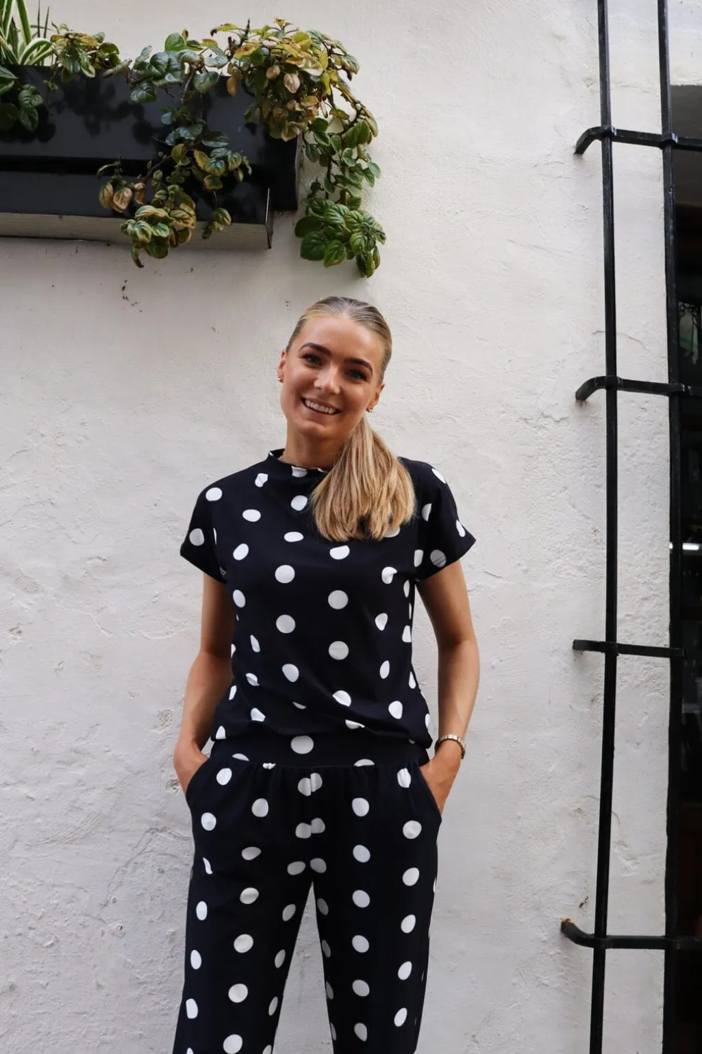 Kortærmet top fra Liberte i sort med store hvide prikker. Toppen er lavet i den bløde Alma-kvalitet med en rund halsudskæring.