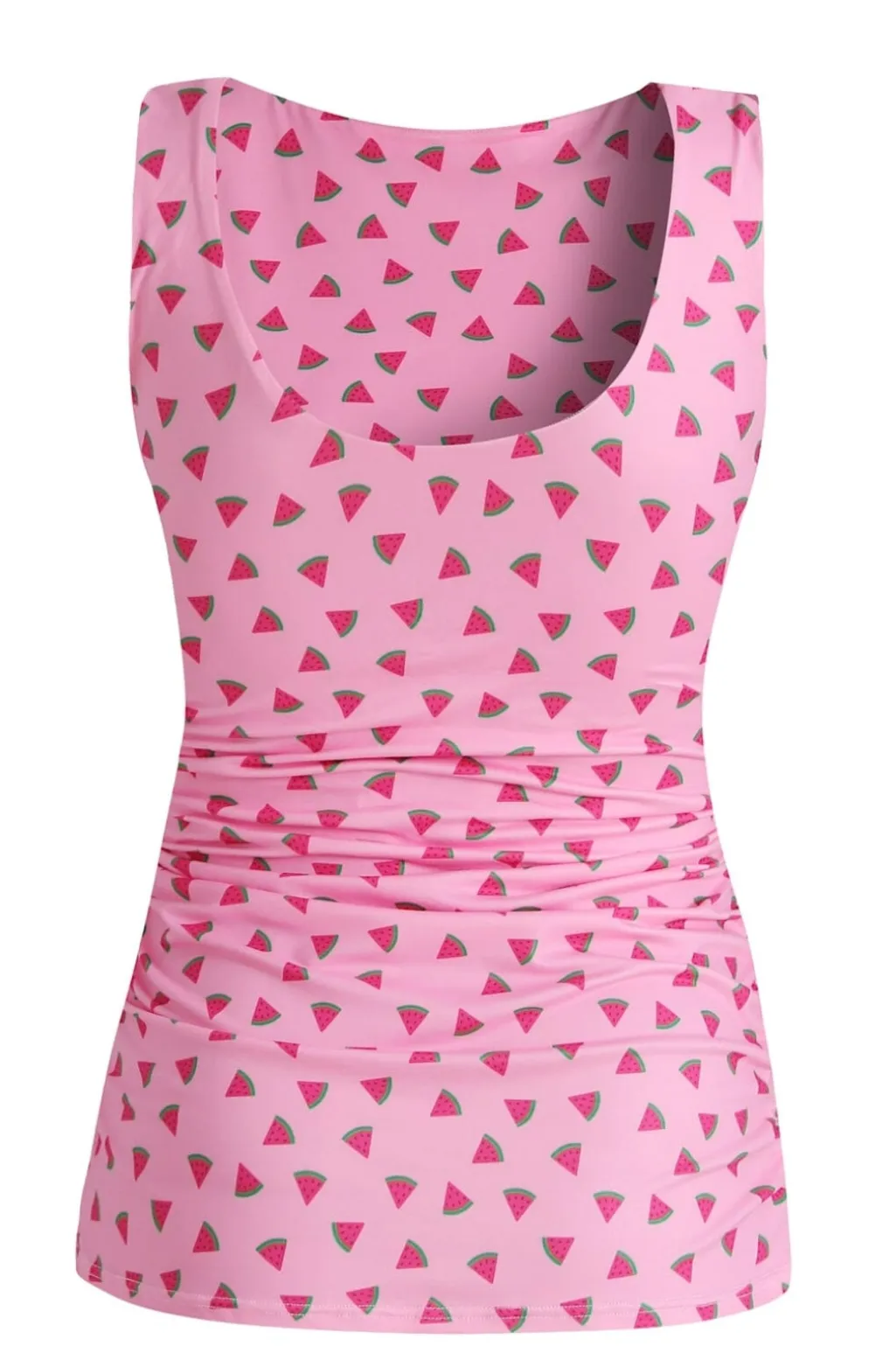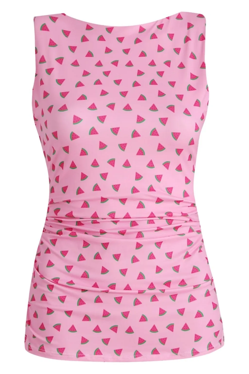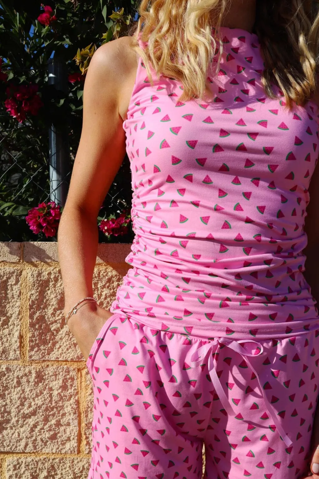 Ærmeløs top fra Liberte i pink med vandmelonprint. Toppen har en høj hals og slim fit-pasform med rynket design og flæsedetaljer.