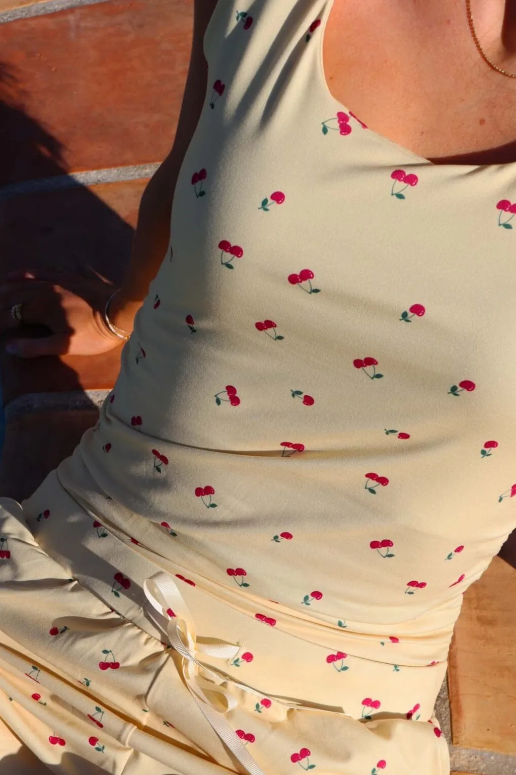 Ærmeløs top fra Liberte med lys gul baggrund og kirsebærprint. Toppen har en rund halsudskæring, bindebånd i siderne og flæsedetaljer.