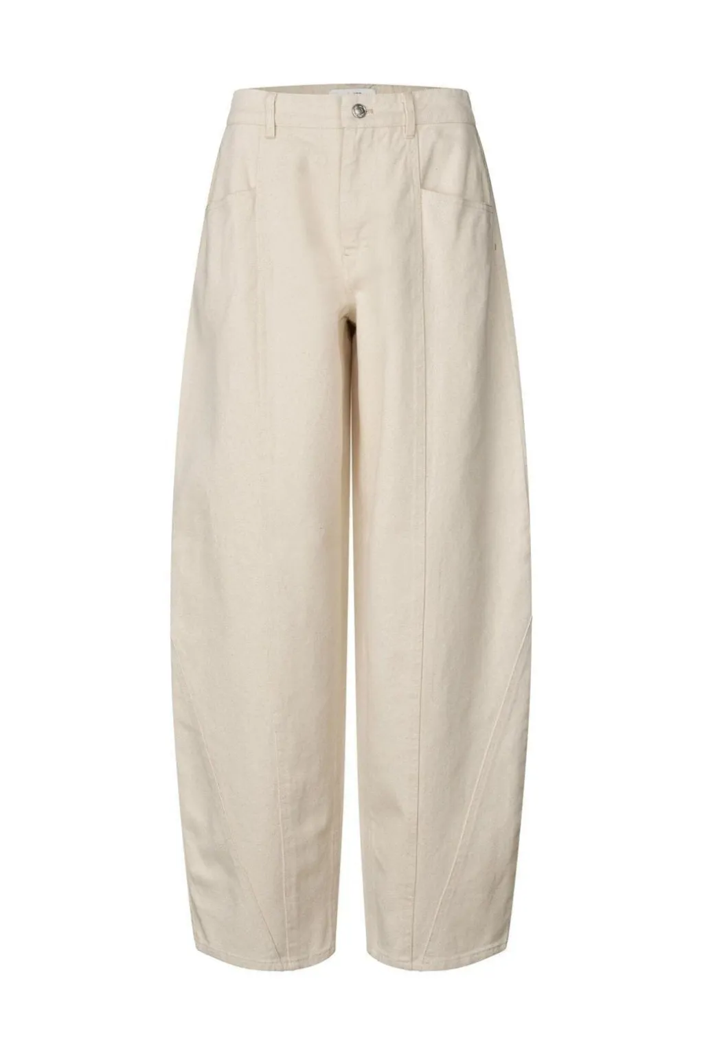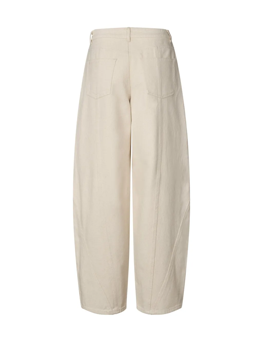 Brede bukser fra MbyM i naturlige toner af hvid og creme. Bukserne har en høj talje og en løs pasform, der går til midt på læggen.
