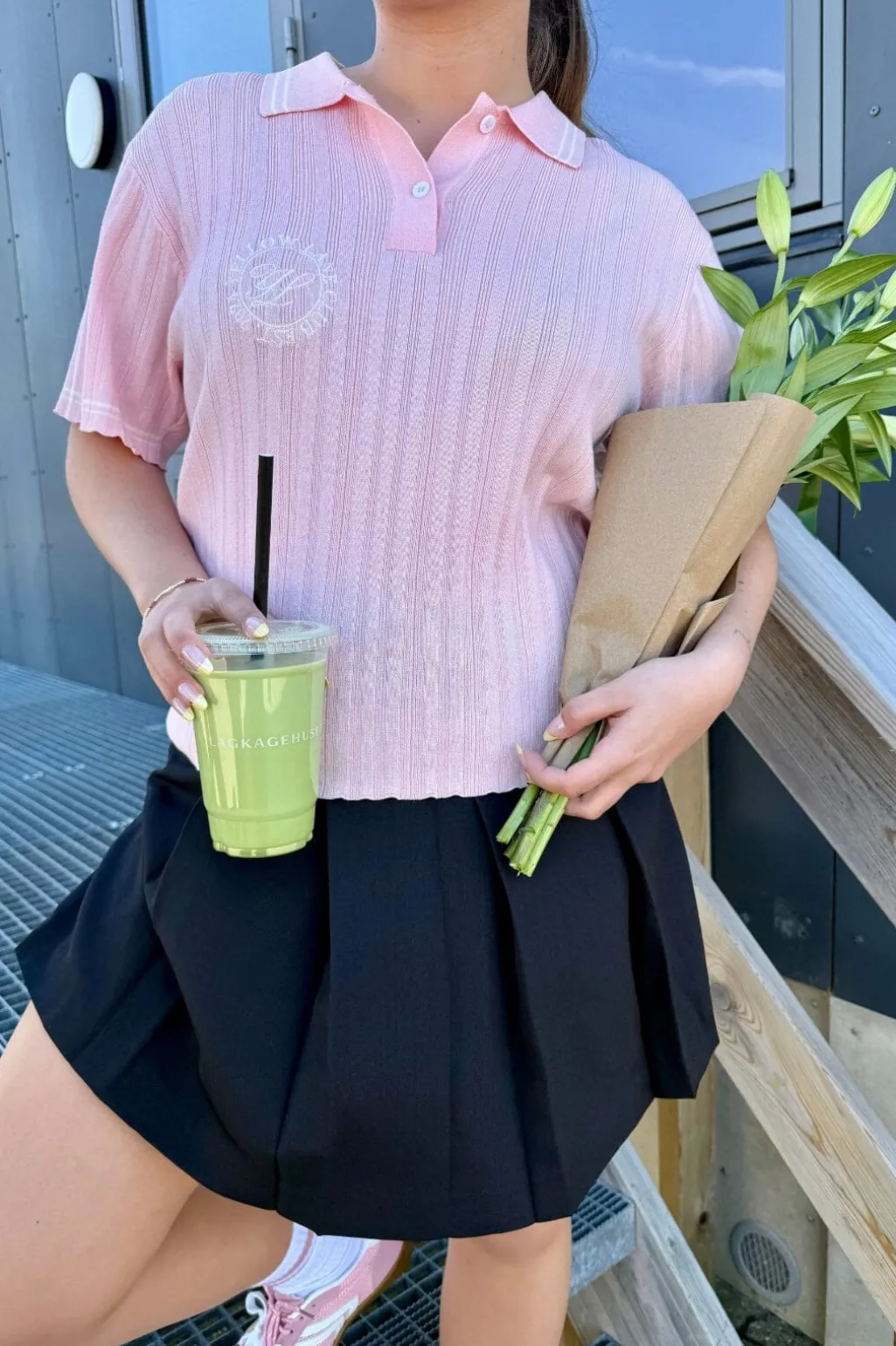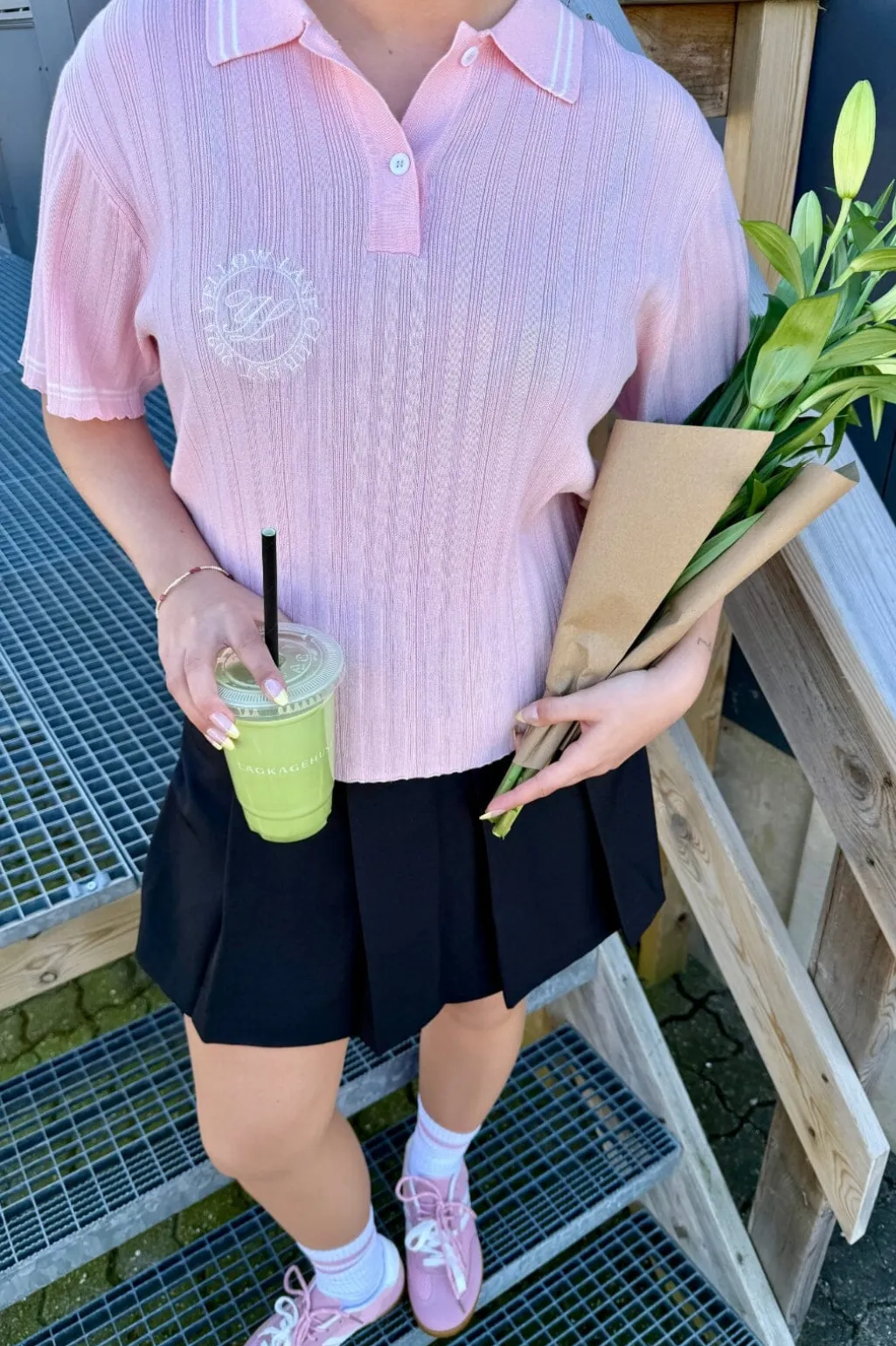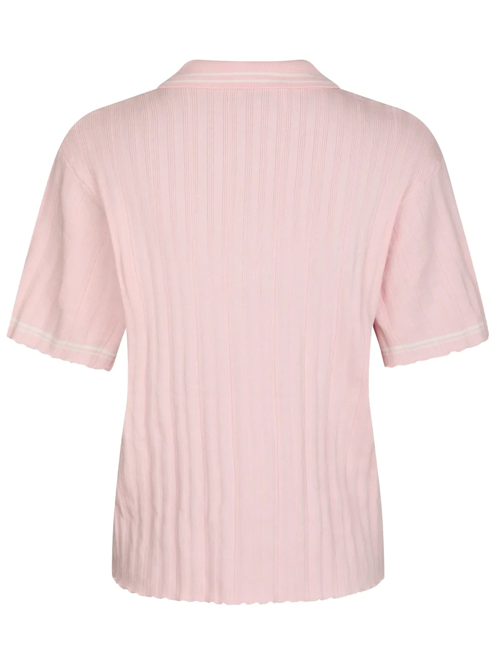 Lyserød polo fra Yellow Lane i ribstrikket design. Den har en klassisk polokrave med knaplukning og hvide kontraststriber på krave og ærmer. Det broderede klublogo på forsiden giver poloen et sporty præg.
