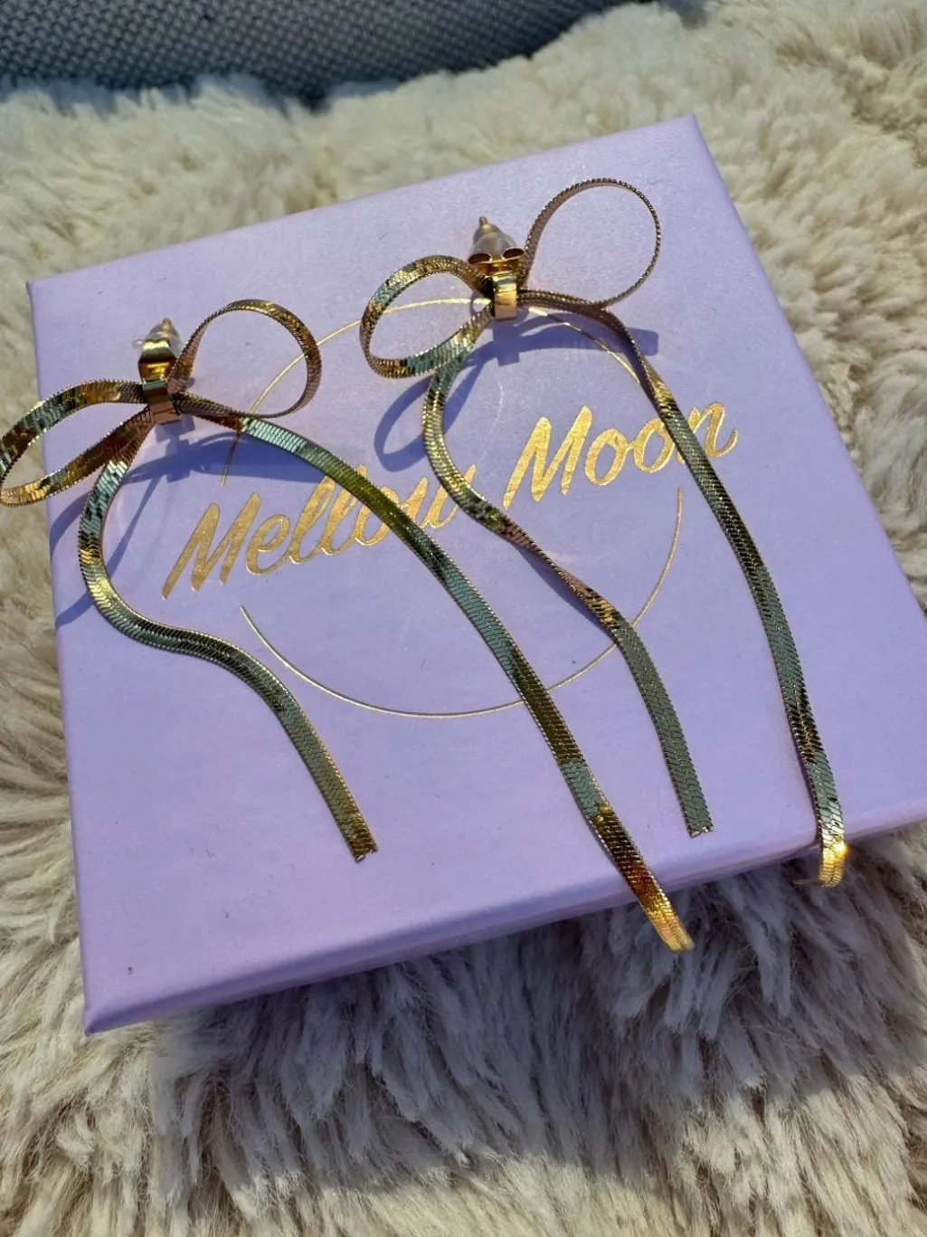 Forgyldte sløjfeøreringe fra Mellow Moon i rustfrit stål. Øreringene har en sløjfeform med lange, bølgende haler og en blank overflade.