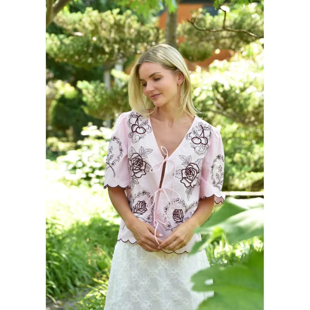 Lyserød bluse fra A-View, lavet af 100 % bomuld. Blusen har blomsterbroderi på forsiden og bindebånd, der giver et feminint udtryk.