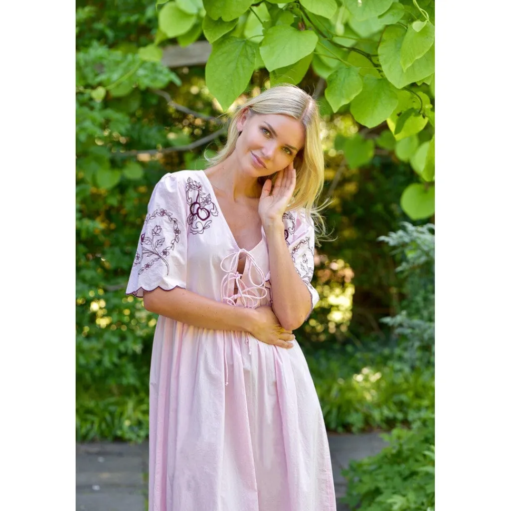 Lyserød kjole fra A-View, lavet af 100 % bomuld. Kjolen har blomsterbroderier på ærmerne og snøredetaljer foran. Den går til læggen og har en løs pasform.