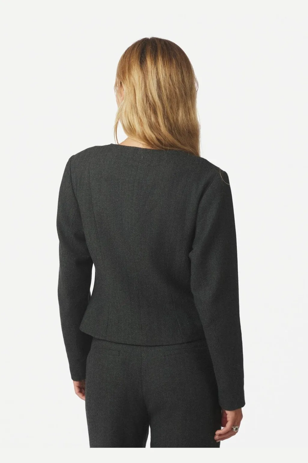Antracitfarvet jakke fra Neo Noir med herringbone-mønster. Jakken har en fitted pasform med buede ærmer og knaplukning foran.