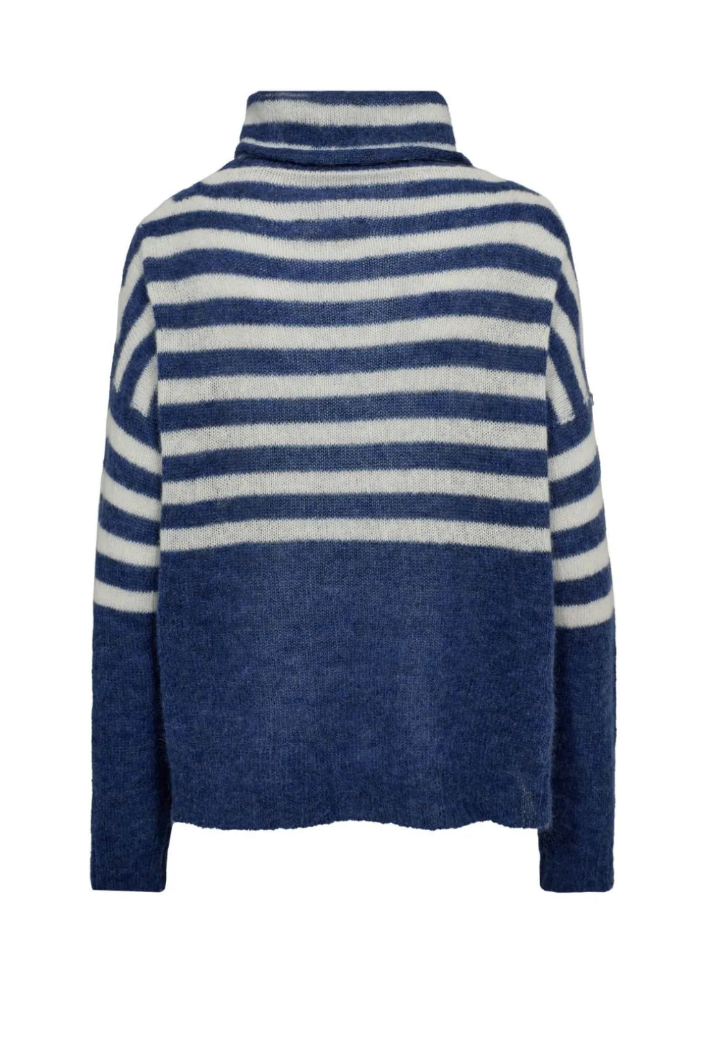 Stribet sweater fra Gossia i blå og off-white. Den har lange ærmer og et løst fit, og den passer godt til afslappede lejligheder.