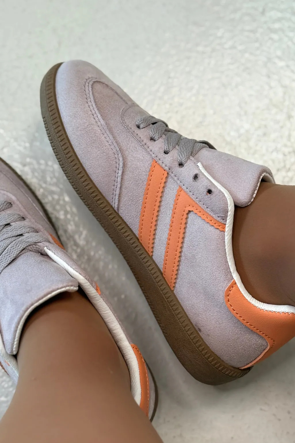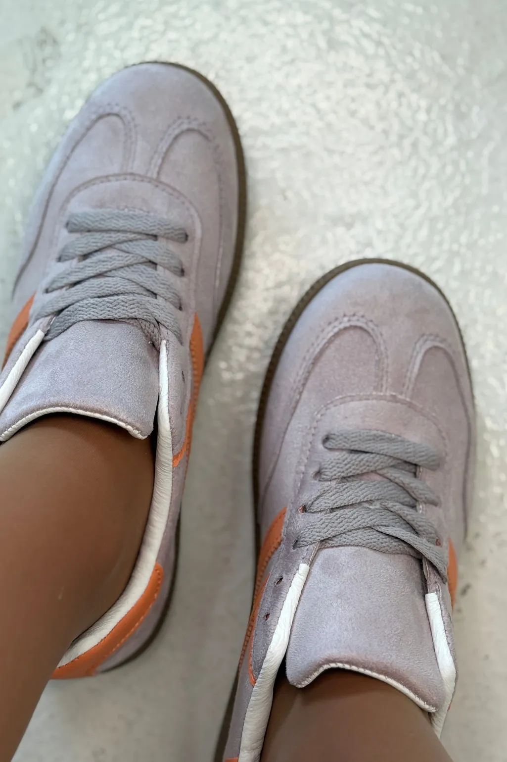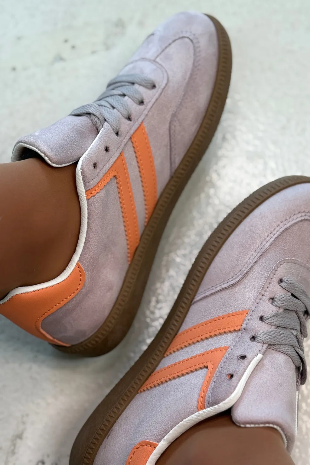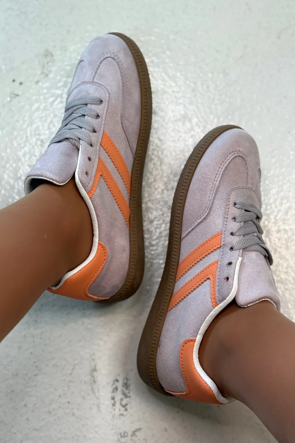 Sneakers fra Bloom i lilla og grå med orange striber på siden. Sålen er brun med et mønster.