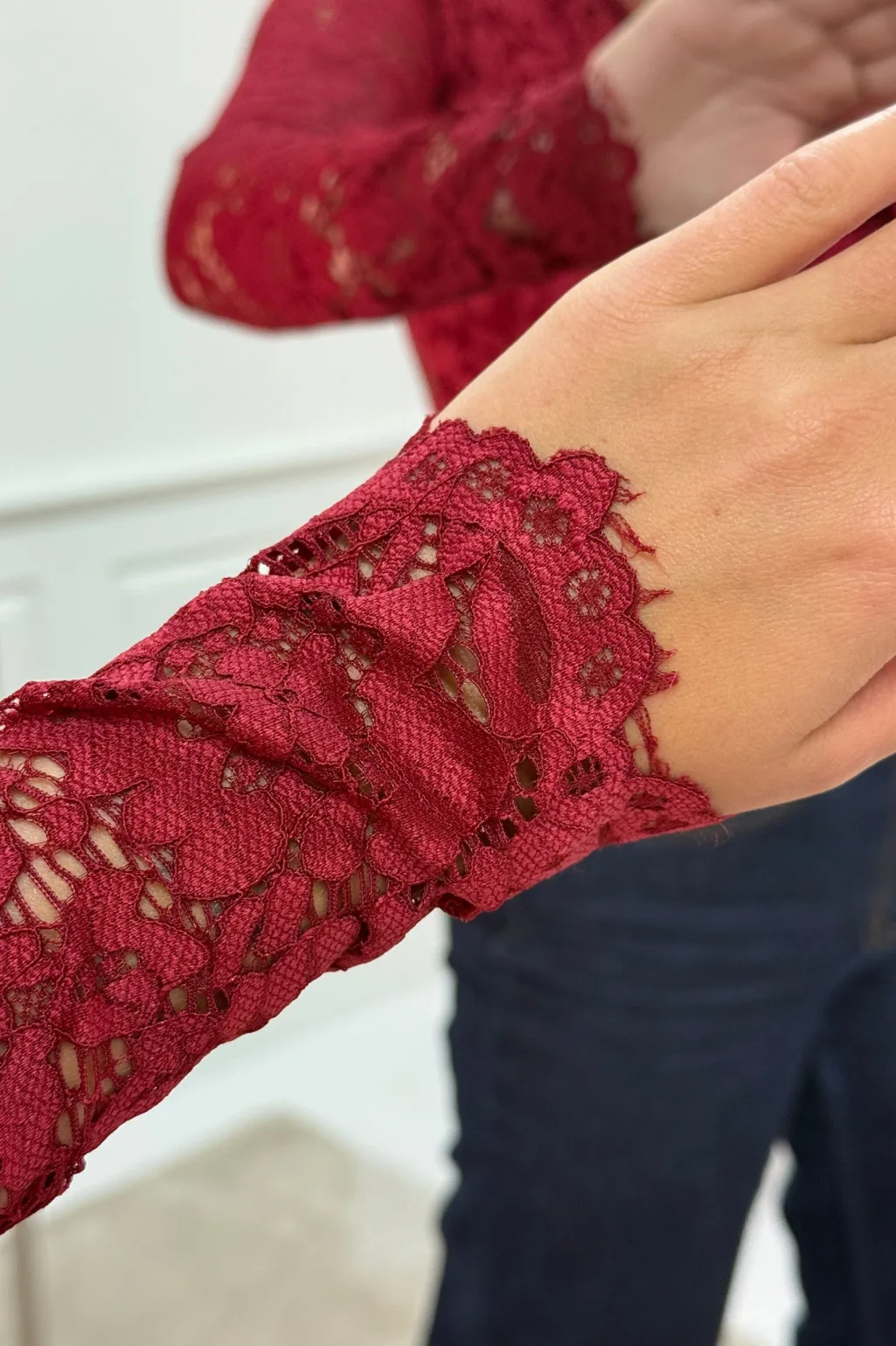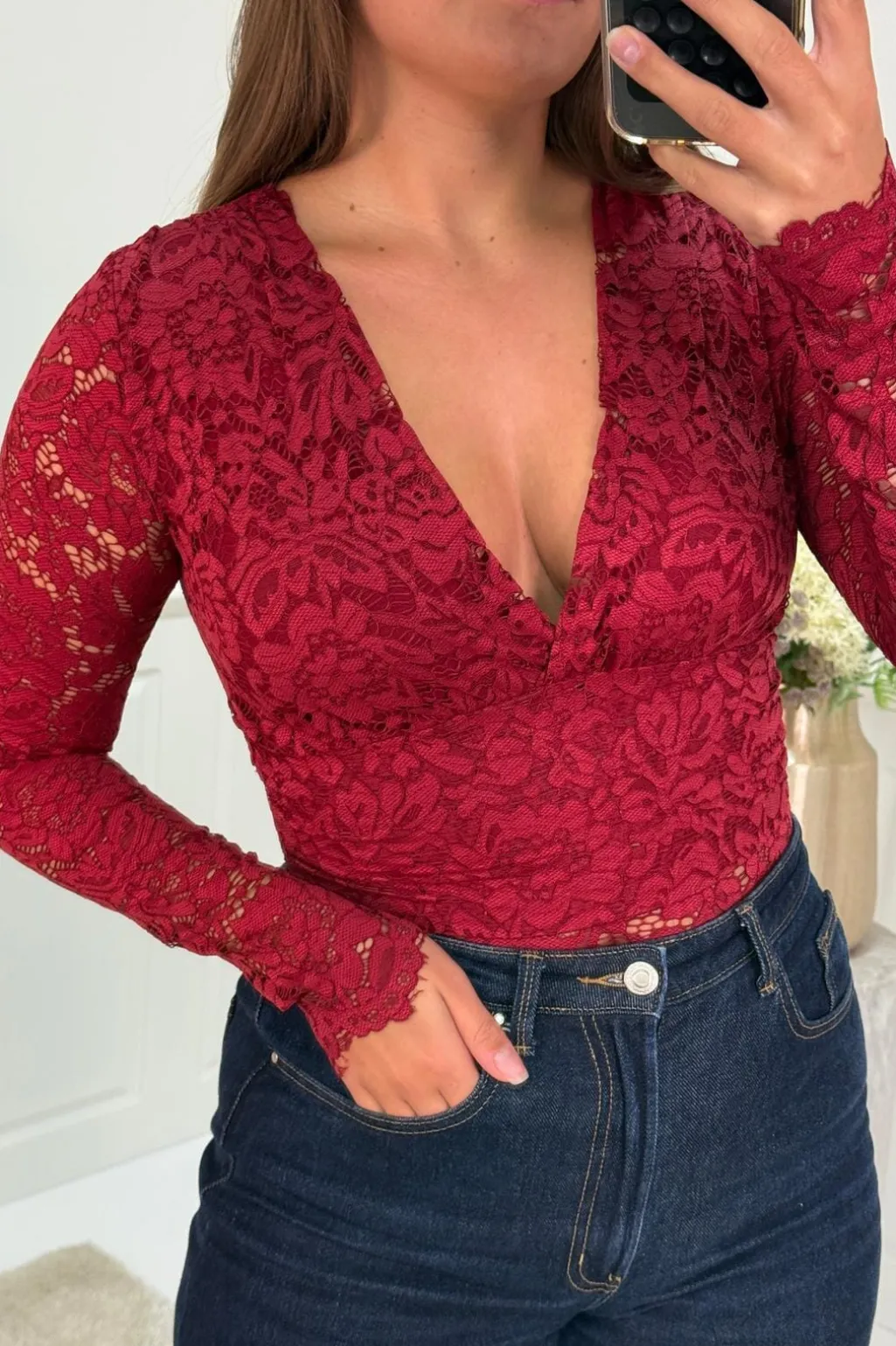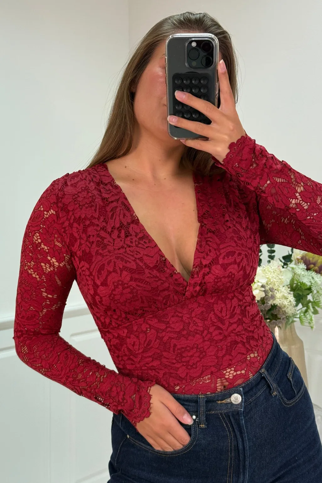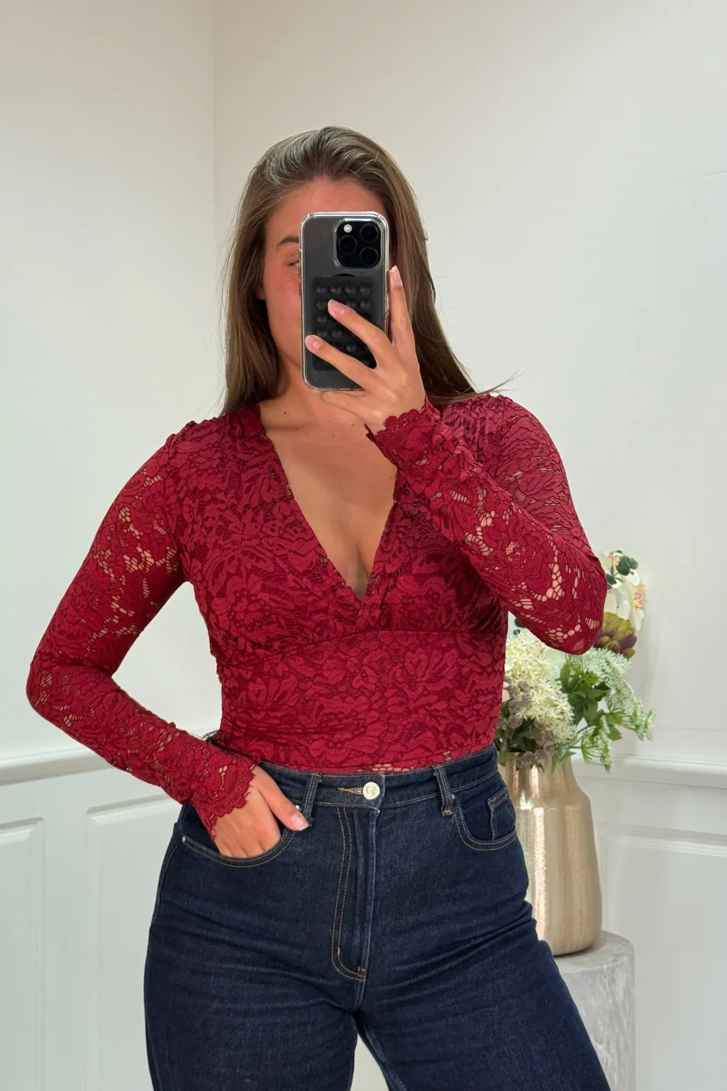 Bodystocking fra A-bee i dyb burgundy med blomstermønster. Lavet af polyester med blonder-detaljer og lange ærmer.