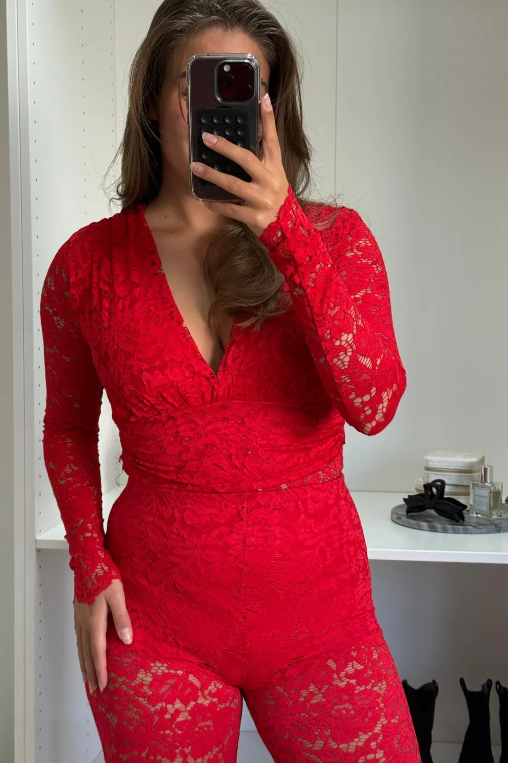 Rød bodystocking fra A-bee med blonder og bindedetaljer i et blomstermønster. Den har V-hals, lange ærmer og en tætsiddende pasform.
