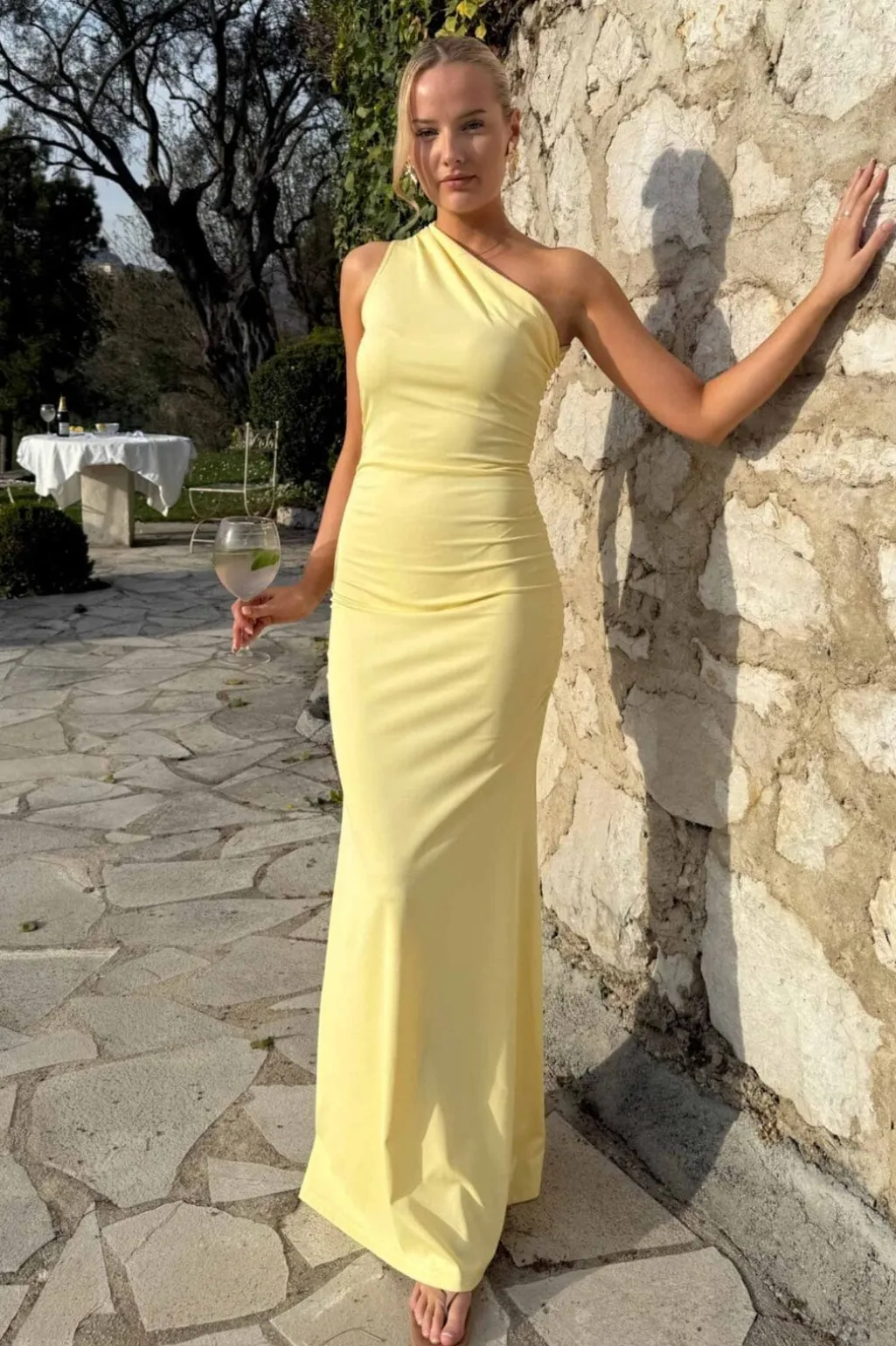 Gul maxikjole fra BYIC med one-shoulder design. A-formen og det strækbare stof giver kjolen en god bevægelighed. Flæsedetaljer langs siden og over skulderen skaber en fin detalje.