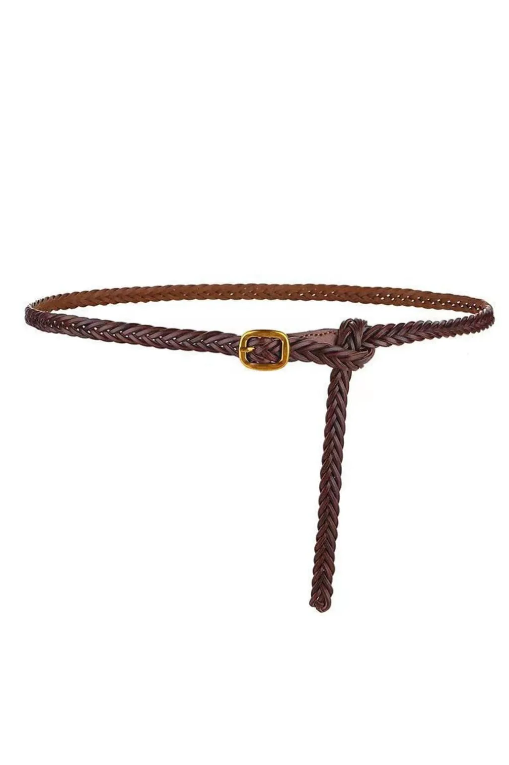 Flettet bælte fra Plissé Copenhagen i cognacbrun. Bæltet har et håndlavet udtryk med sin flettede struktur og et gyldent spænde som lukning.