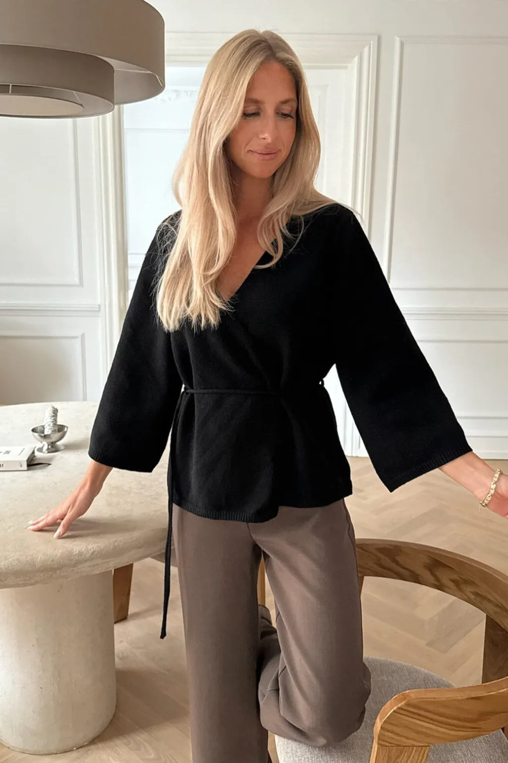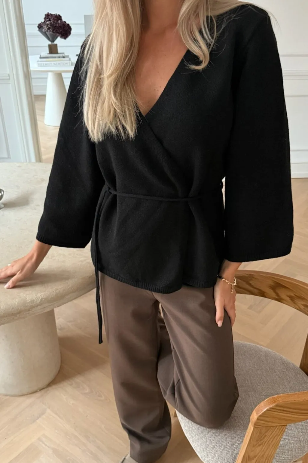 Smuk wrap-cardigan i sort.Denne cardigan lukkes foran med en wrap-funktion, der skaber en flatterende V-udskæring. Den bindes i taljen med et elegant, slankt bælte, der fremhæver taljen. For et mere boxy look kan du binde bæltet løsere.Cardiganen har brede 3/4 ærmer, der afsluttes med en slank, elegant ribkant. De resterende kanter er også afsluttet med en slank ribdetalje for et ekstra raffineret touch.True to size.