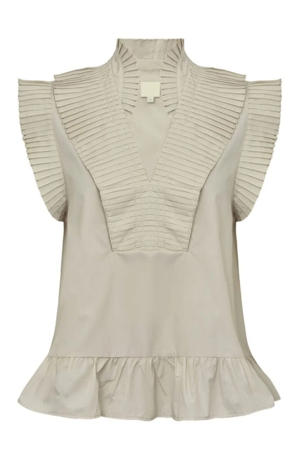 Cremefarvet top fra Gossia med A-facon og dyb V-udskæring. Toppen har plisserede flæser ved kraven, halsen og ærmegabet, der skaber en fin struktur.