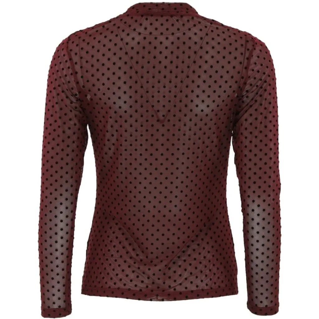 Langærmet mesh-bluse fra Continue i en dyb bordeauxnuance med sort prikket mønster. Blusen har en gennemsigtig mesh-kvalitet med høj hals og slim fit-pasform.