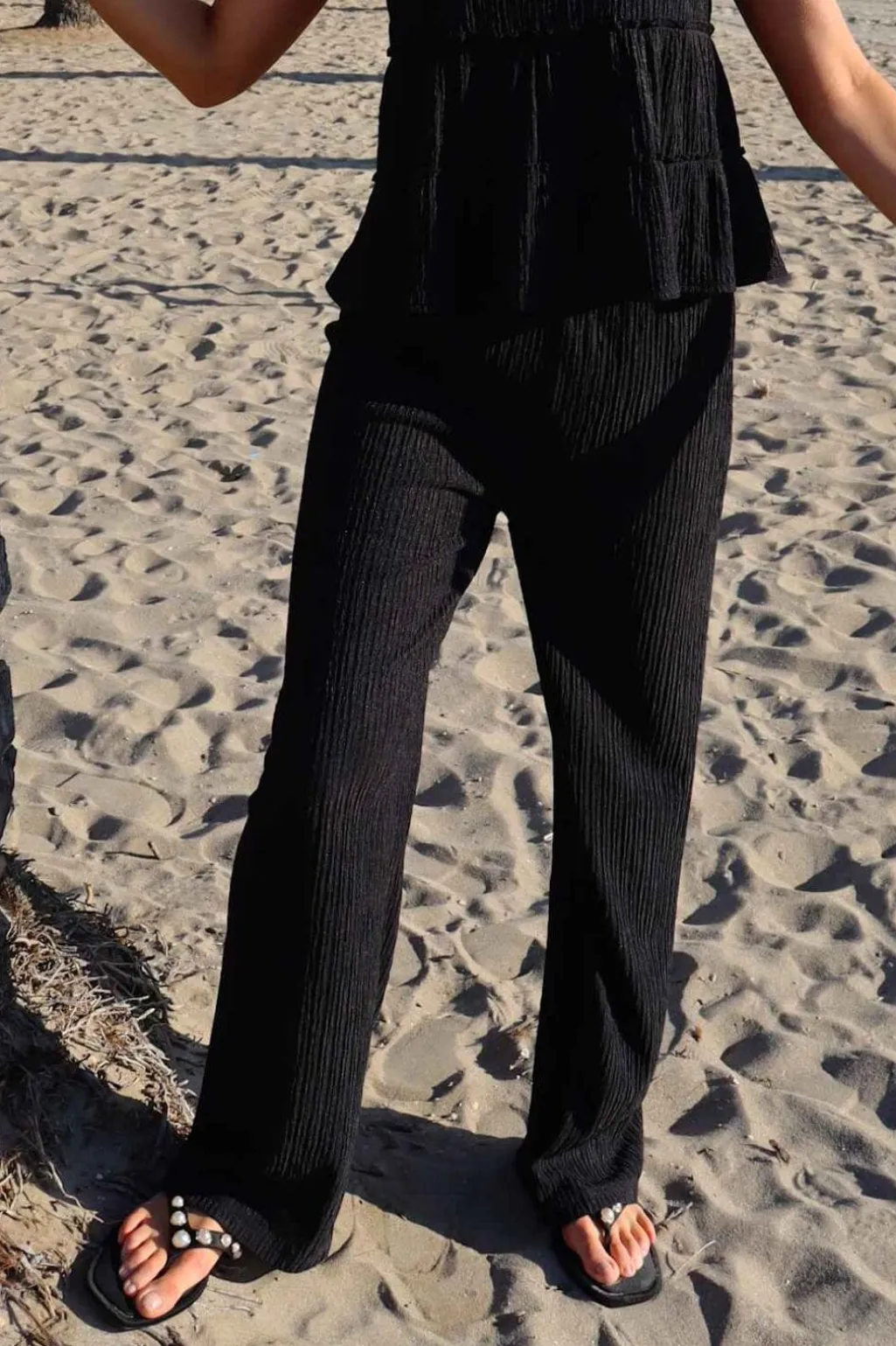 Sorte bukser fra Liberte med et ribbet, stribet mønster. Bukserne er gulvlange og har en praktisk elastisk lukning i taljen. Det stribede design skaber en flot silhuet.