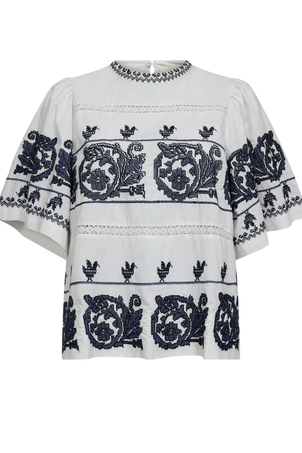Hvid bluse fra Gossia med blåt broderi. Det detaljerede mønster består af blomster og fugle, der danner bånd hen over stoffet. Blusen har høj hals og korte ærmer.