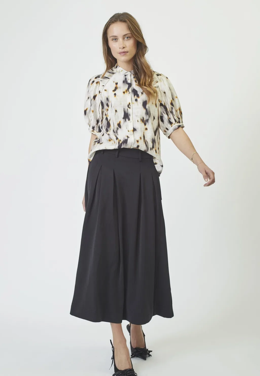 Sort plisseret nederdel fra Co’Couture med læglængde. Nederdelen har bæltestropper og lommer i siderne. Det plisserede design giver bevægelse og fald i stoffet.